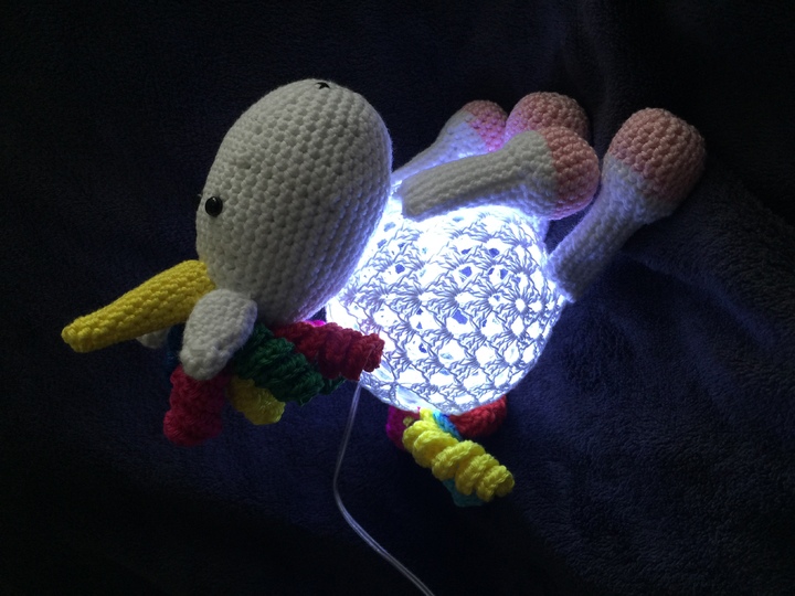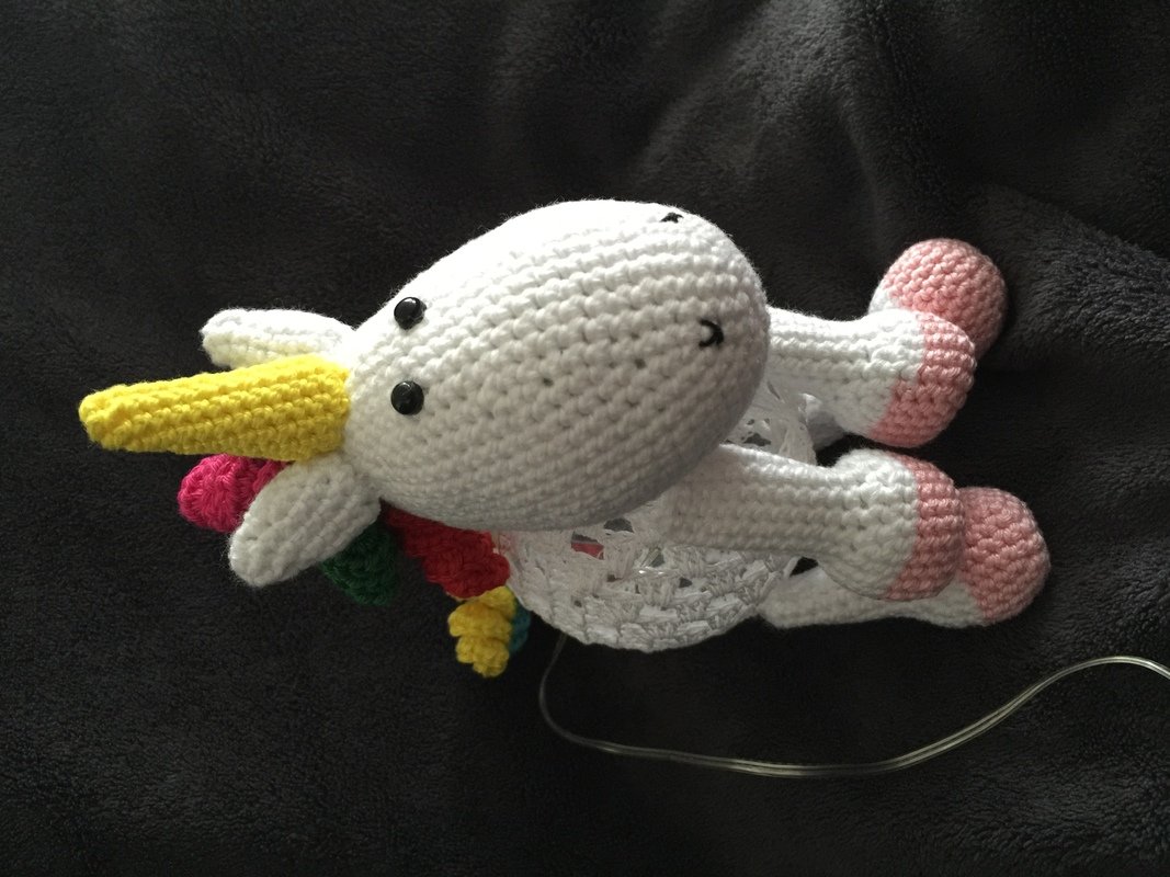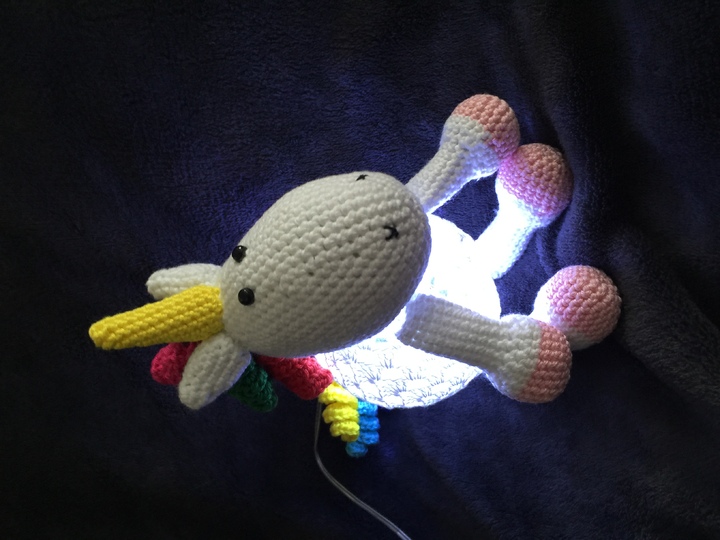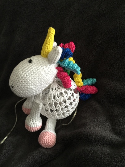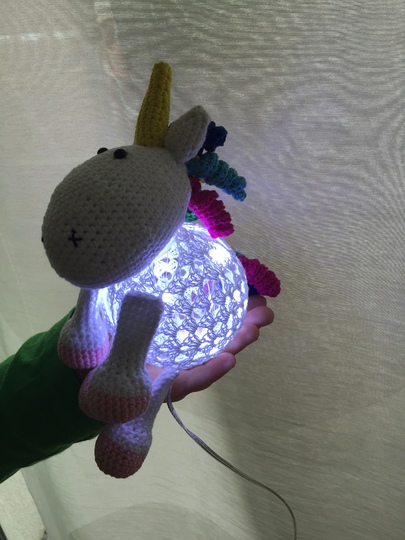 Das Einhorn leuchtet mit einer batteriebetriebenen LED Lichterkette, die in einer teilbaren Acrylkugel steckt.