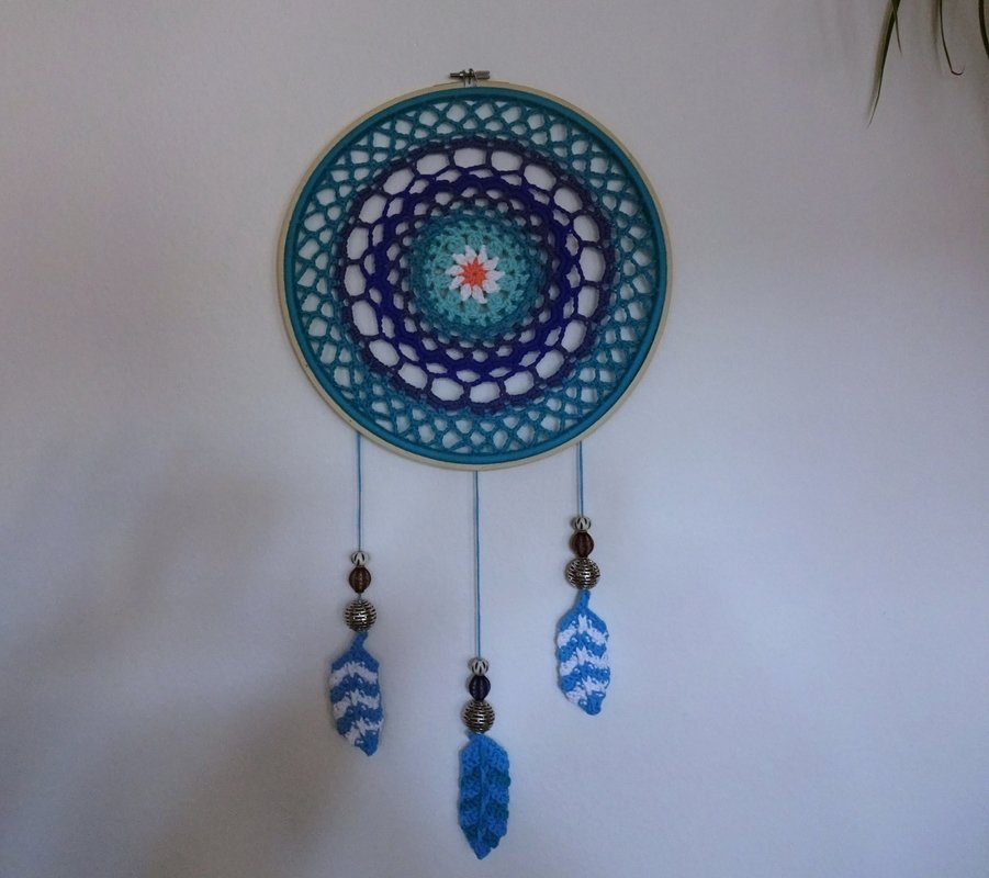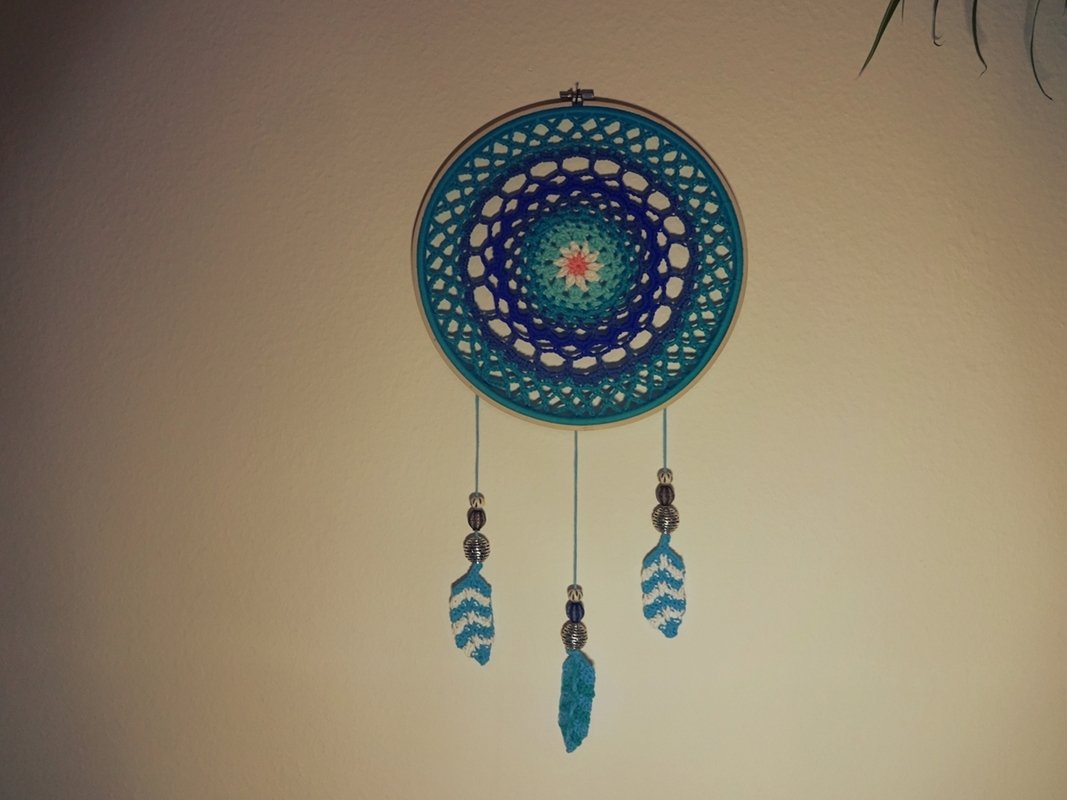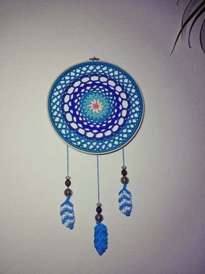Mein neuerr Traumfänger "Wolkenblau" ist mit 30 cm Durchmesser recht auffällig.