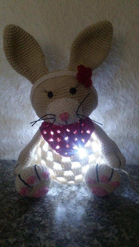 Die kleine Hasen Dame passt nicht nur zu Ostern sondern egal zu welcher Zeit. Sie kann einfach nur als Deko genutzt werden oder auch als Nachttischlampe für die kleinsten :)