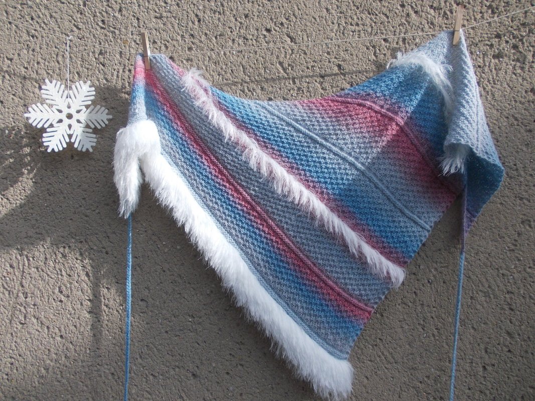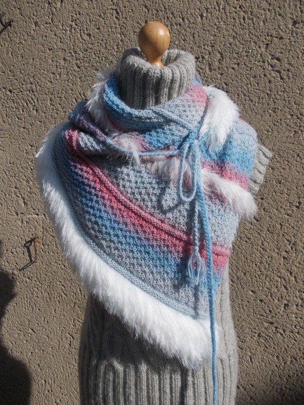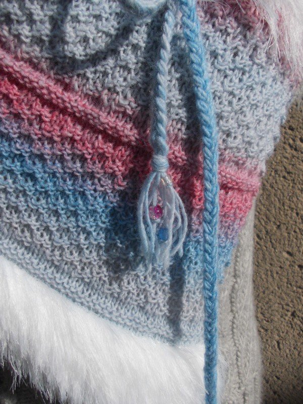 Pastellige Farben und die Kante aus Fransengarn in Pelzoptik machen dieses Tuch zu einem schönen Accessoire für den Winter. Die Bindebänder sorgen für zusätzlichen Halt und sind ein weiterer Hingucker, den man nicht missen möchte.
