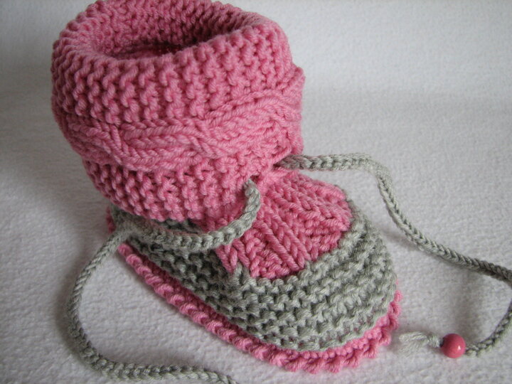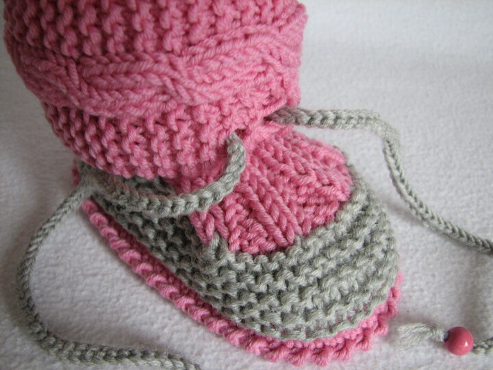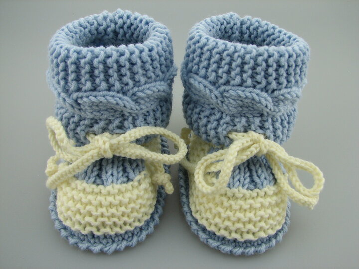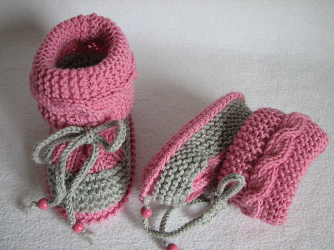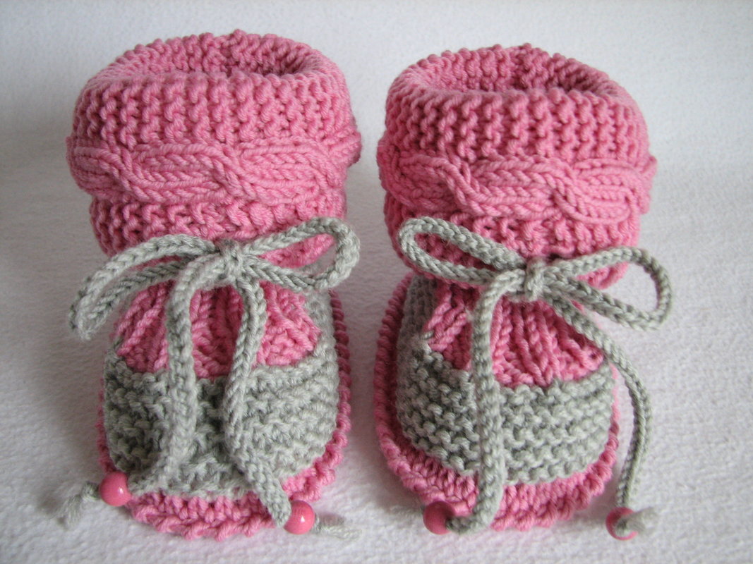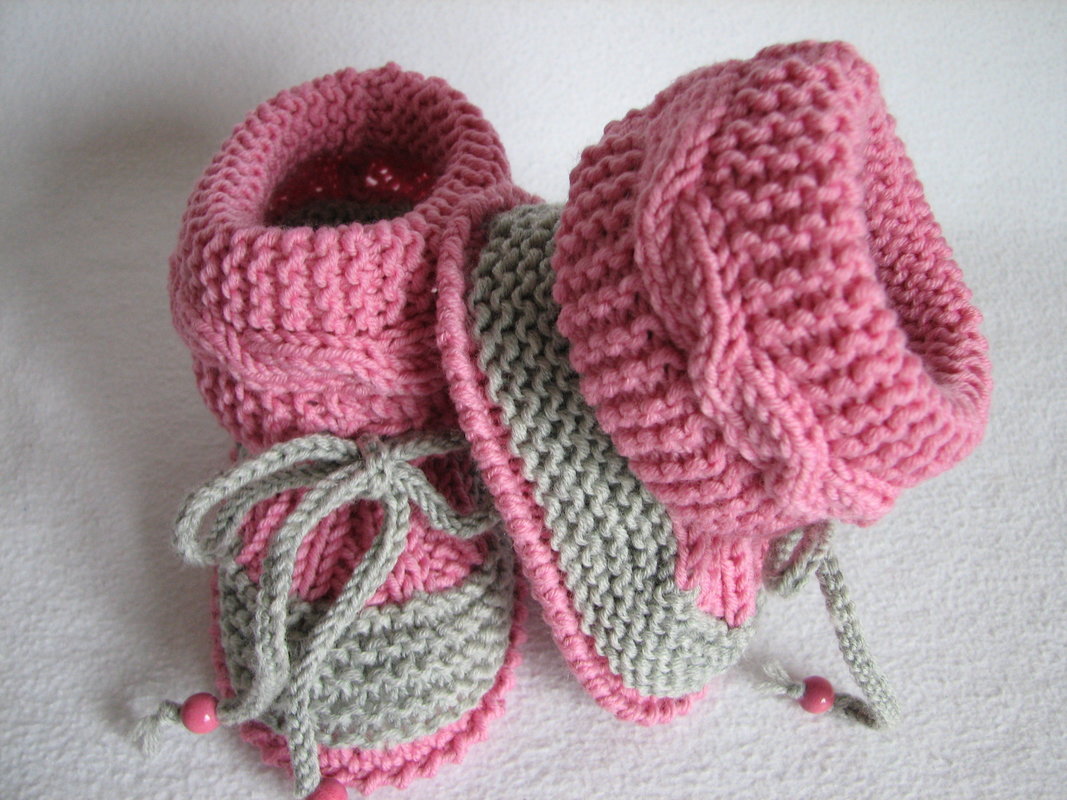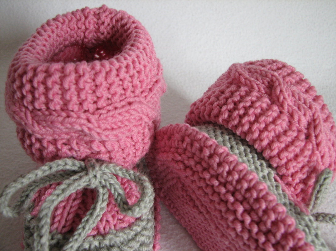 die Babystiefelchen werden mit einem Nadelspiel gestrickt.