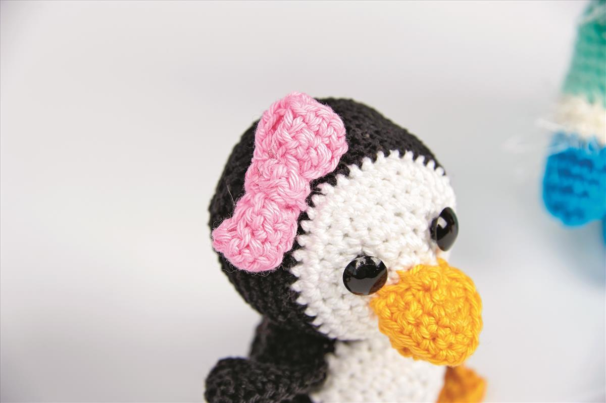 Häkel dir eine 3-köpfige Pinguinfamilie mit Dekoelementen wie Schleife, Weihnachtskugel oder Zuckerstange.