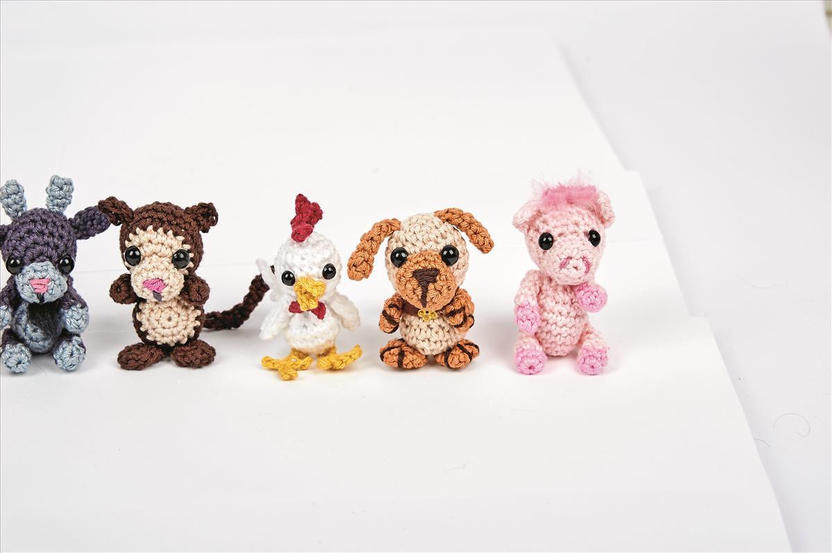 Ratte: Je ca. 20 g Baumwollhäkelgarn Fb grau; Rest rosa; Kunststoffaugen ¯ 6 mm; Füllwatte; PerlonFd, schwarz ¯ 0,3 Mm; Pompon, rosa ¯ 8 mm; Sticktwist, schwarz; HŠkelNd Nr. 2,5 - 3; WollNd; Alleskleber Hund: Je ca. 20 g BaumwollhŠkelgarn Fb beige und Fb braun; Kunststoffaugen ¯ 6 mm; FŸllwatte; Stick- twist, braun; Rest Filz dunkelbraun; Paillette, gold; HŠkelNd Nr. 2,5 Ð 3; WollNd; Alleskleber Schwein: Je ca. 20 g BaumwollhŠkelgarn Fb hellrosŽ; Rest rosa; Kunststoffaugen ¯ 6 mm; FŸllwatte; Sticktwist, altrosa; Filzwolle, rosa; HŠkelNd Nr. 2,5 - 3; WollNd; Alleskleber Ochse: Je ca. 20 g BaumwollhŠkelgarn Fb rotbraun; Rest beige; Kunststoffaugen ¯ 6 mm; FŸllwatte; Sticktwist, braun; Filzwolle, braun; HŠkelNd Nr. 2,5 - 3; WollNd; Alleskleber Ziege: Je ca. 20 g BaumwollhŠkelgarn Fb dunkelgrau; Rest hellgrau; Kunststoffaugen ¯ 6 mm; FŸllwatte; Sticktwist, altrosa; Filzwolle, schwarz; HŠkelNd Nr. 2,5 - 3; WollNd; Alleskleber Hase: Je ca. 20 g BaumwollhŠkelgarn Fb karamellbraun; Kunststoffaugen ¯ 6 mm; FŸllwatte; PerlonFd, schwarz ¯ 0,3 Mm; Pompon, wei§ ¯ 10 mm; HŠkelNd Nr. 2,5 - 3; WollNd; Alleskleber Affe: Je ca. 20 g BaumwollhŠkelgarn Fb dunkelbraun; Rest beige; Kunststoffaugen ¯ 6 mm; FŸllwatte; Sticktwist, altrosa; HŠkelNd Nr. 2,5 - 3; WollNd; Alleskleber Schlange: Je ca. 20 g BaumwollhŠkelgarn Fb dunkelgrŸn; Rest hellgrŸn und rot; Kunststoffaugen ¯ 6 mm; falsche Wimpern; FŸllwatte; Sticktwist, schwarz; Rest Filz, wei§; Chenilledraht, grŸn; HŠkelNd Nr. 2,5 - 3; WollNd; Alleskleber Drache: Je ca. 20 g BaumwollhŠkelgarn Fb grŸn; Rest rot und gelb; Kunststoffaugen ¯ 6 mm; FŸllwatte; HŠkelNd Nr. 2,5 - 3; WollNd; Alleskleber Hahn: Je ca. 20 g BaumwollhŠkelgarn Fb wei§; Rest rot und gelb+; Kunststoffaugen ¯ 6 mm; FŸllwatte; HŠkelNd Nr. 2,5 - 3; WollNd; Alleskleber Pferd: Je ca. 20 g BaumwollhŠkelgarn Fb braun; Rest beige+ Kunststoffaugen ¯ 6 mm; FŸllwatte; Sticktwist, braun; Filzwolle, braun; HŠkelNd Nr. 2,5 - 3; WollNd; Alleskleber Tiger: Je ca. 20 g BaumwollhŠkelgarn F