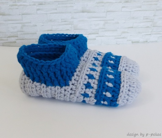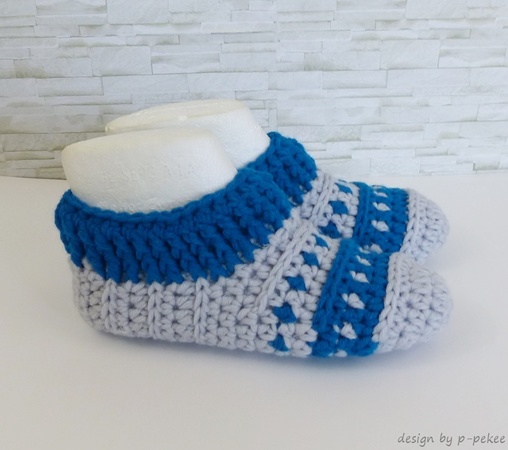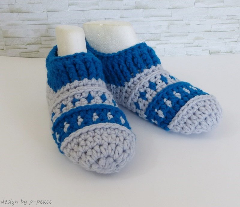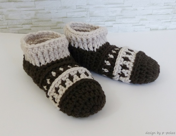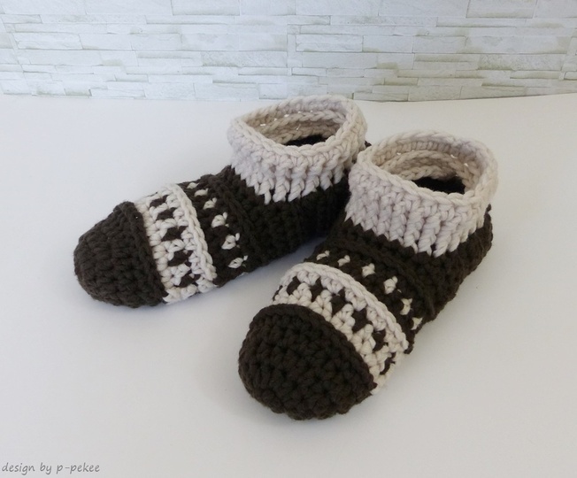 sind gehäkelte Hausschuhe / Hüttenschuhe / Puschen mit schönem Muster. Warme Füße im Winter sind damit garantiert. Die Schuhe sind bequem und man kann sie auch super überall mitnehmen.