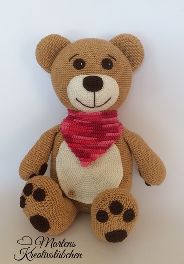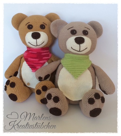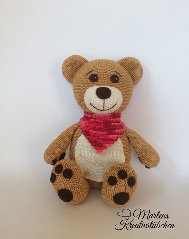 Der Bär auf den Bildern wurde mit einer Wolle 50g/125m und einer Nadelstärke 2,5 gehäkelt.