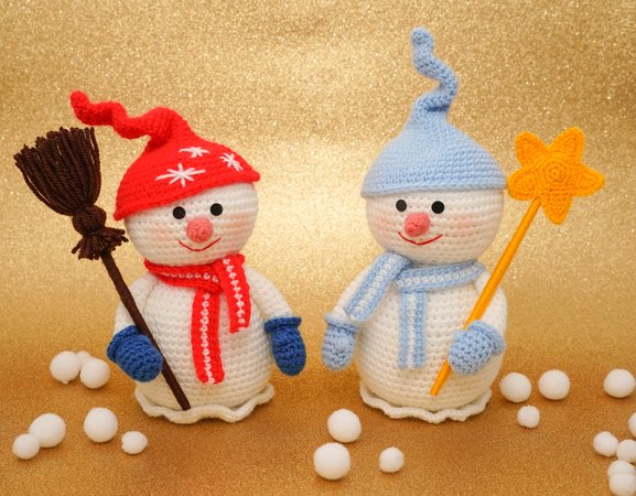Süße Schneemänner sind perfekte Weihnachtsdekoration und Geschenkidee! Die Beschreibungen von Sternchen und Besen sind inbegriffen! ;) Kopf und Körper werden als einzelne Detail gehäkelt.
