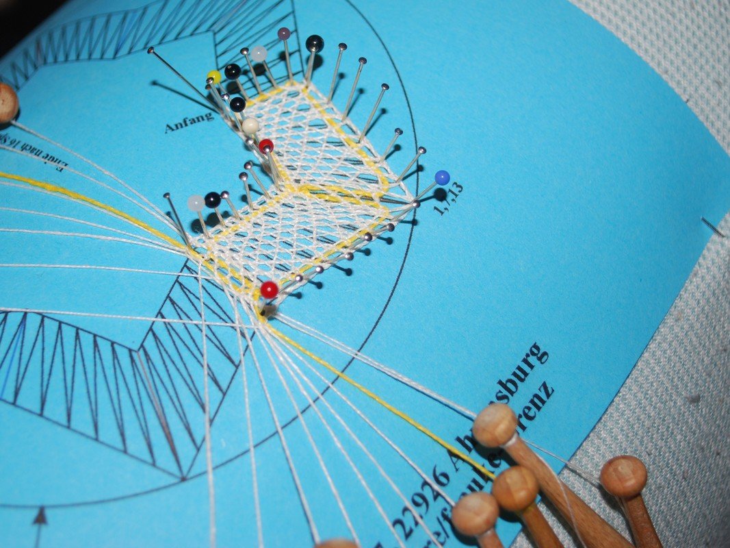 Der Stern ist aus Leinengarn gearbeitet und besteht aus zwei geklöppelten Bändern, die zu einer besonderen Hexentreppe verwebt werden. Es werden Leinengarn 40/2,ein Konturfaden z. B. Leinengarn 14/2 in gelb, Stärke, eine Klöppelausrüstung mit 9 Paarenund und ein 1 LED Teelicht gebraucht.