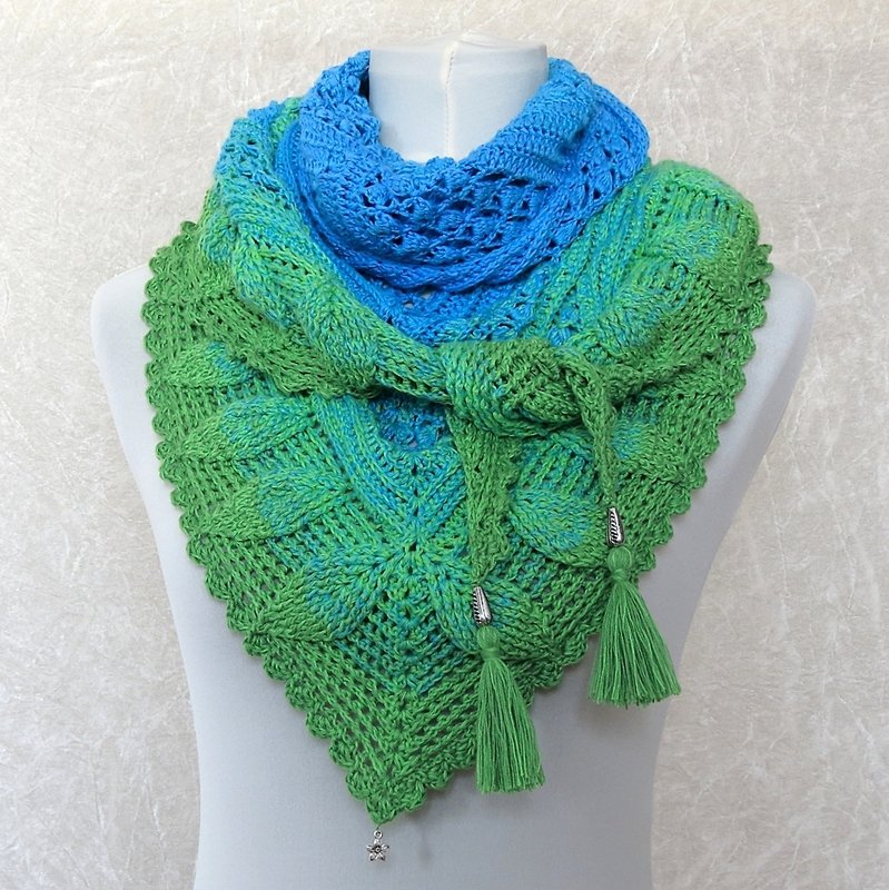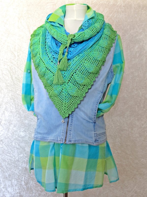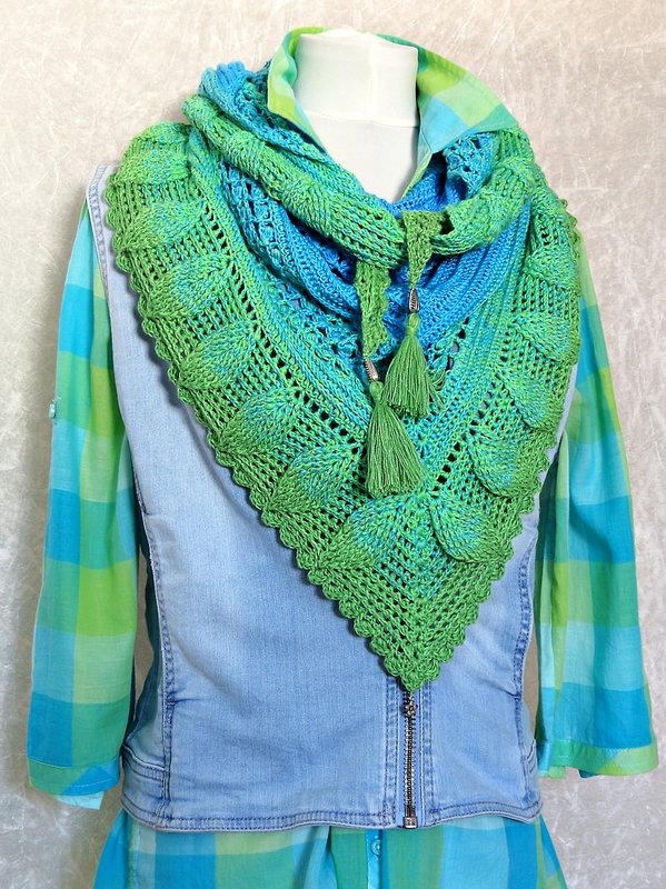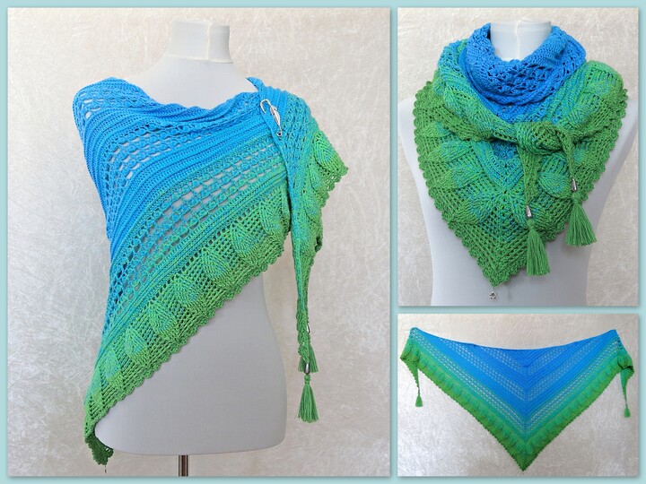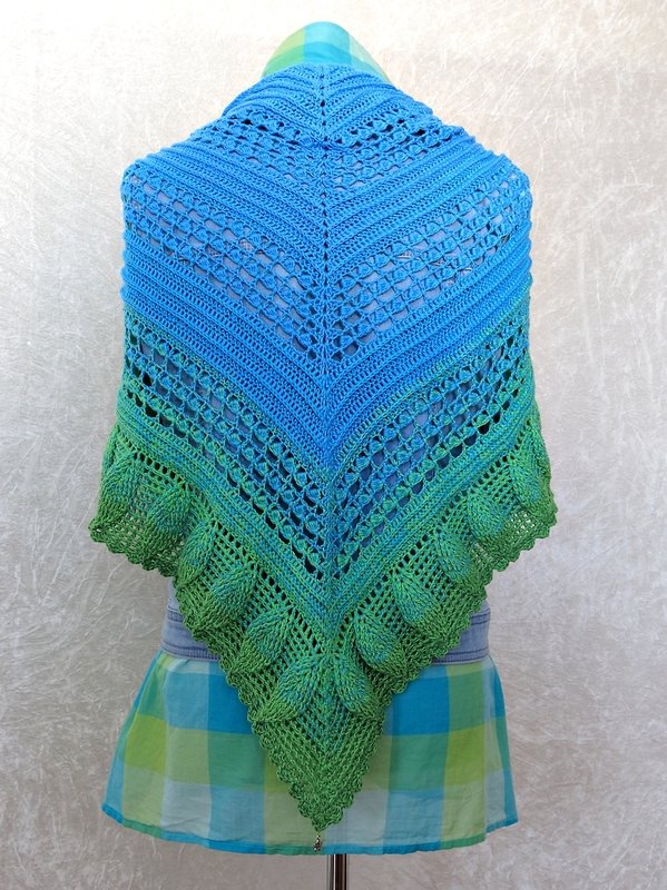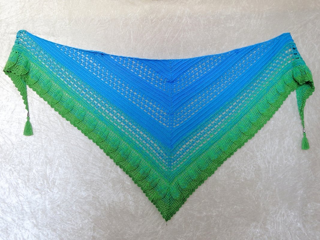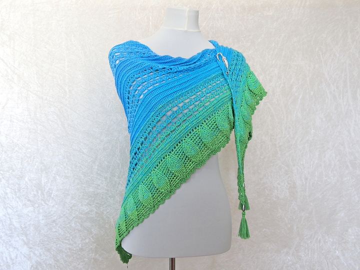 Blue Lagoon is a beautiful triangle-shaped shawl which is worked from top to the lower tip.