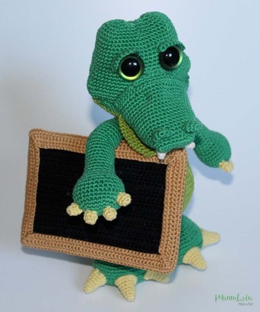 Mit dieser Häkelanleitung könnt ihr euch den im Artikelbild gezeigten Alligator mit Tafel zaubern.