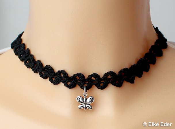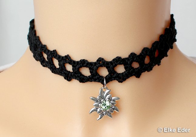 Material: Häkelgarn Stärke 10 (z. B. Anchor Aida bzw. Woll Butt Diana), Häkelnadel 2,0 mm, Nähnadel (zum Vernähen der Fäden), Klemmverschluss (evtl. mit Verlängerungskettchen), 8 mm breit, evtl. Metallanhänger mit Biegering