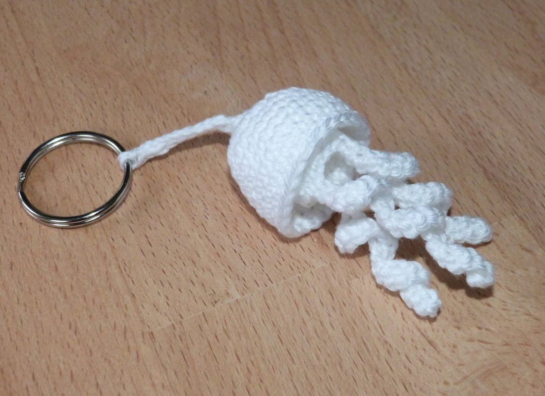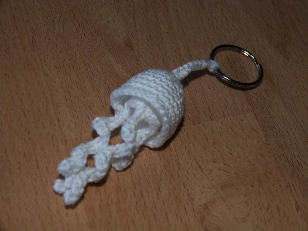 Bei Verwendung von Baumwollgarn mit einer Lauflänge von ca. 170m/50g und Nadelstärke 1,5 wird die Qualle etwa 7 cm lang und 3 cm breit. Zusätzlich brauchst du noch einen Schlüsselring.
