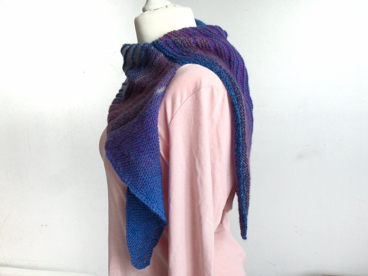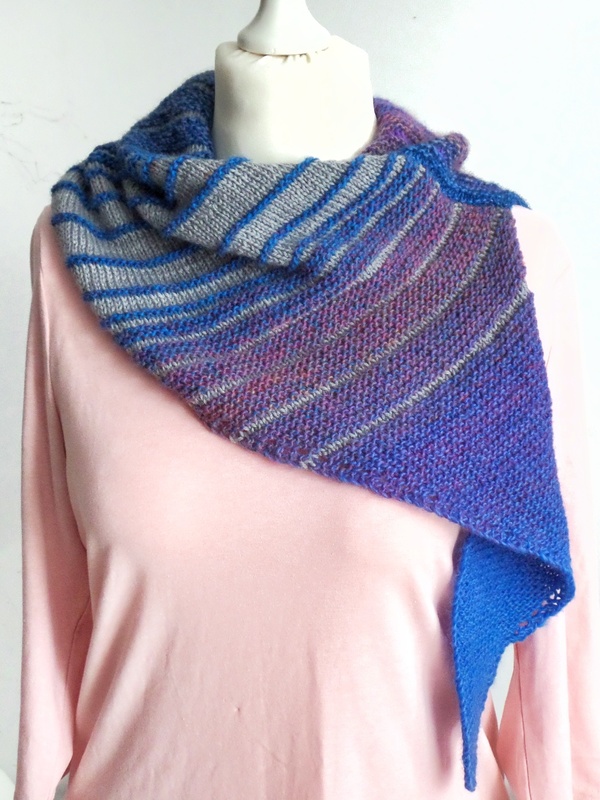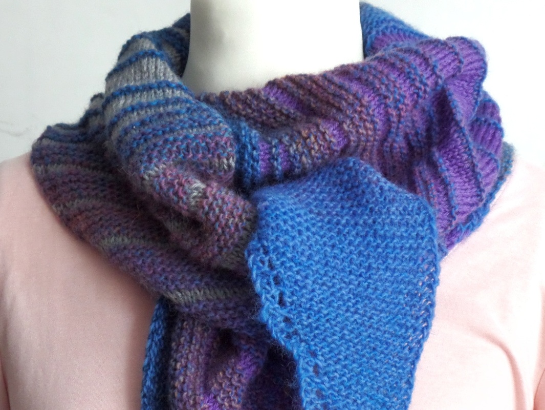 Musterschal 1 (blau) beinhaltet 3 Farben, davon ist eine ein Verlaufsgarn.