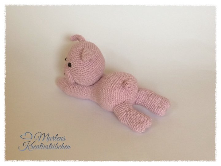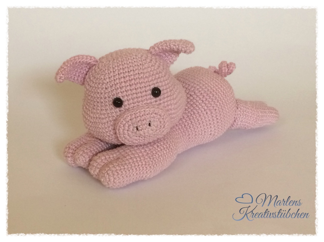 Das Schweinchen auf den Bildern wurde mit einer Wolle 50g/125m und einer Nadelstärke 2,0 gehäkelt.