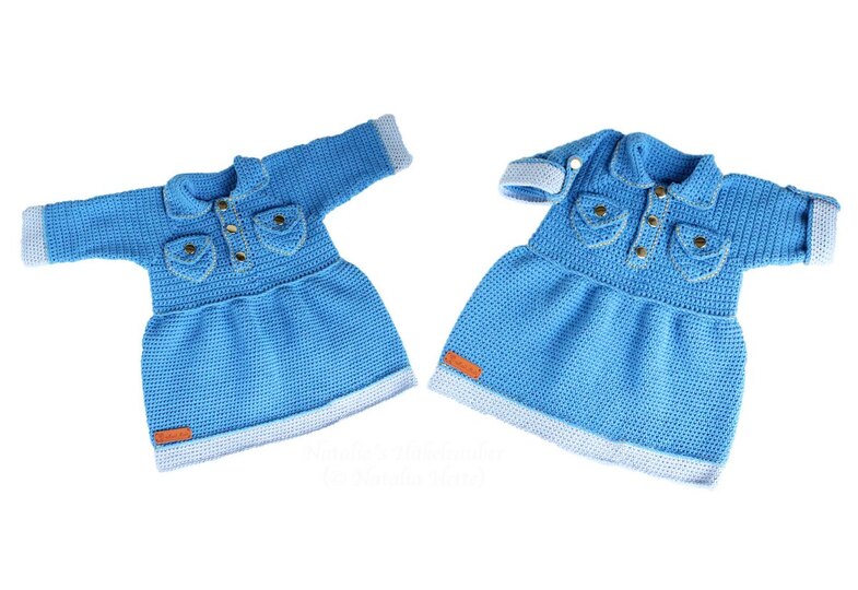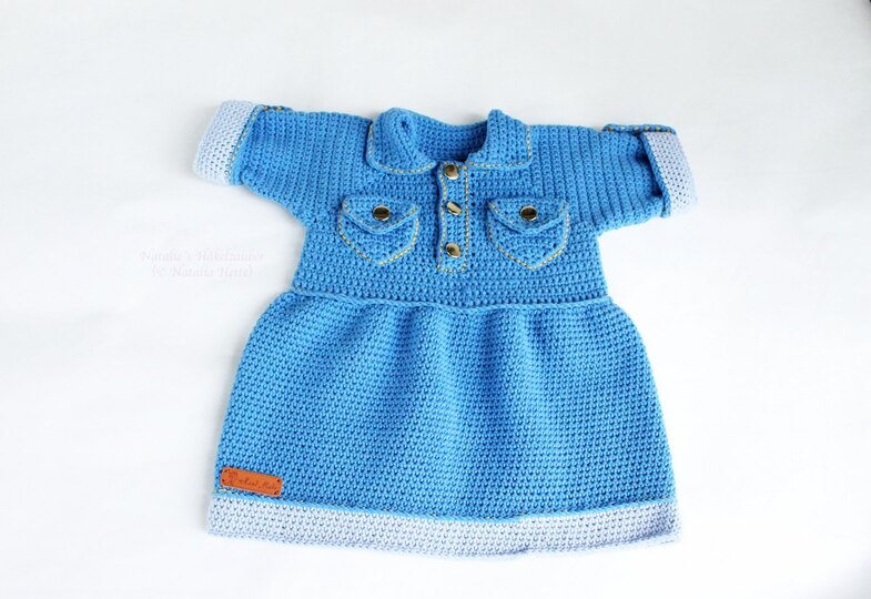 Diese PDF-Häkelanleitung besteht aus bebilderter Anleitung zum Häkeln von Baby- oder Kinderkleid für Gr. 56-98 (Neugeborene bis 3-jähriges Kind). Das Kleid wurde mit Taschen und Absteppung dekoriert und kann mit langen Ärmel oder mit gekrempelten Ärmeln (mit Ärmelhalter) getragen werden.