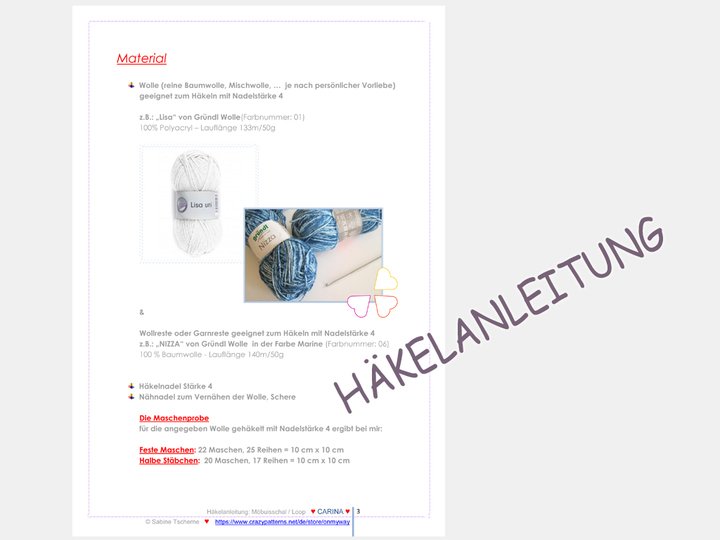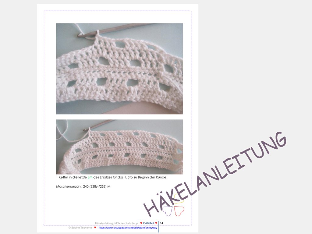 ♥ Die Häkelanleitung für den Möbius-Schal CARINA ist in folgenden Größen: S/M/L (Umfang: 55/58/61 cm).