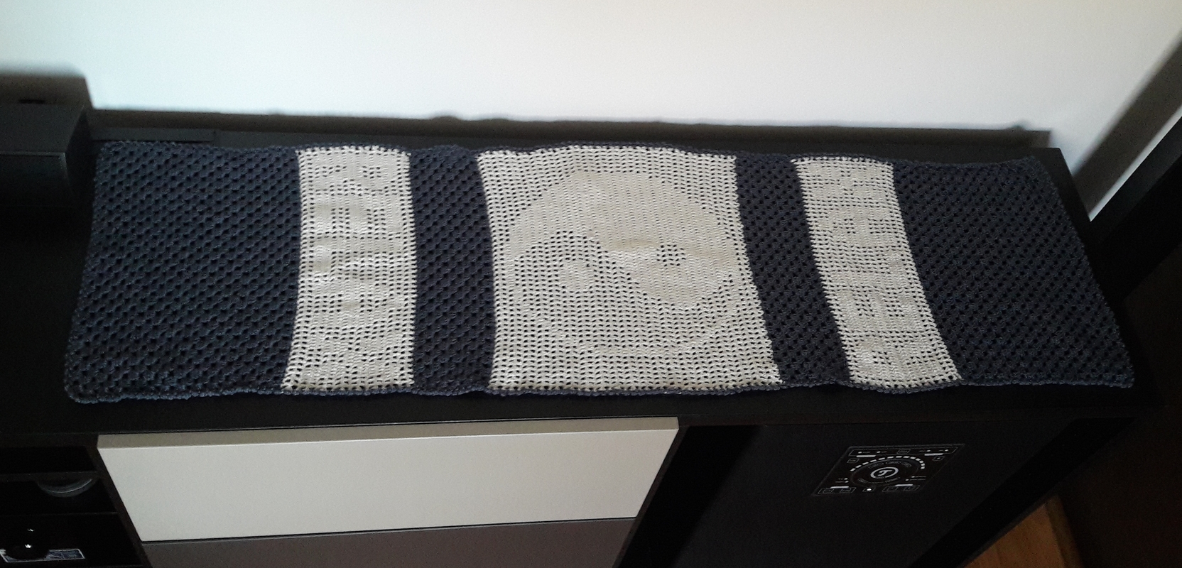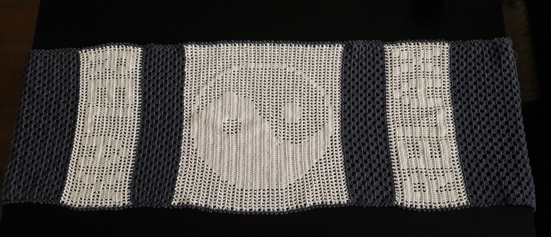 Mein Tischläufer hat eine Größe von 122x37. Er kann jedoch beliebig vergrößert oder verkleinert werden, indem man die dunklen Teile des Läufers länger oder kürzer häkelt.