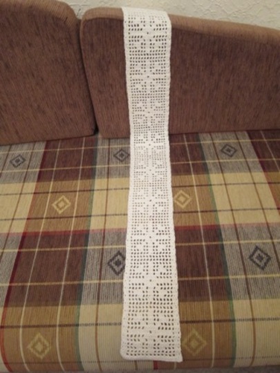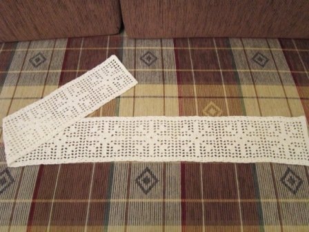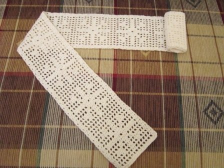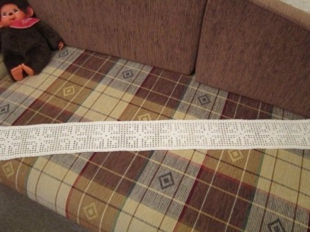 Bei mir ist das Tischband 115 cm lang und 12,5 cm breit. Gehäkelt habe ich es mit einer Nadelstärke 3,0 und einem Baumwollgarn 125m / 50g. (z.B. Gründl "Mango uni" in Creme)