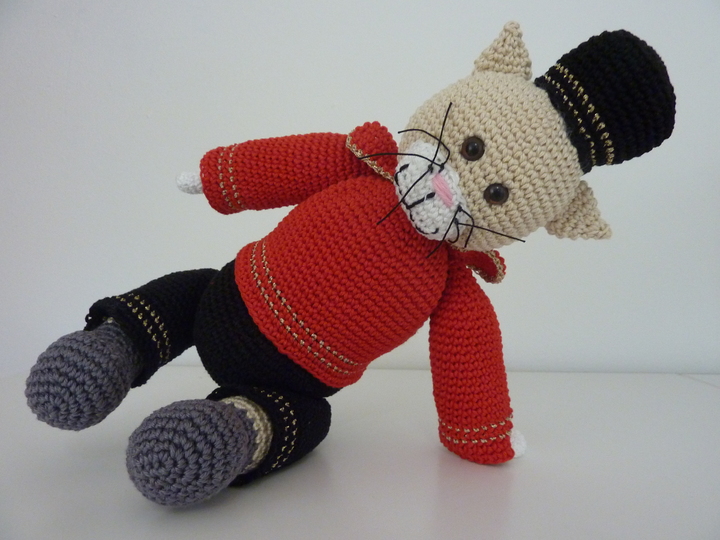 Kasimir Kater wird, unter Verwendung des angegebenen Materials, sitzend 25 cm hoch. Ich persönlich empfehle für das Nacharbeiten all meiner Kuscheltiere und -Figuren Baumwollgarn.