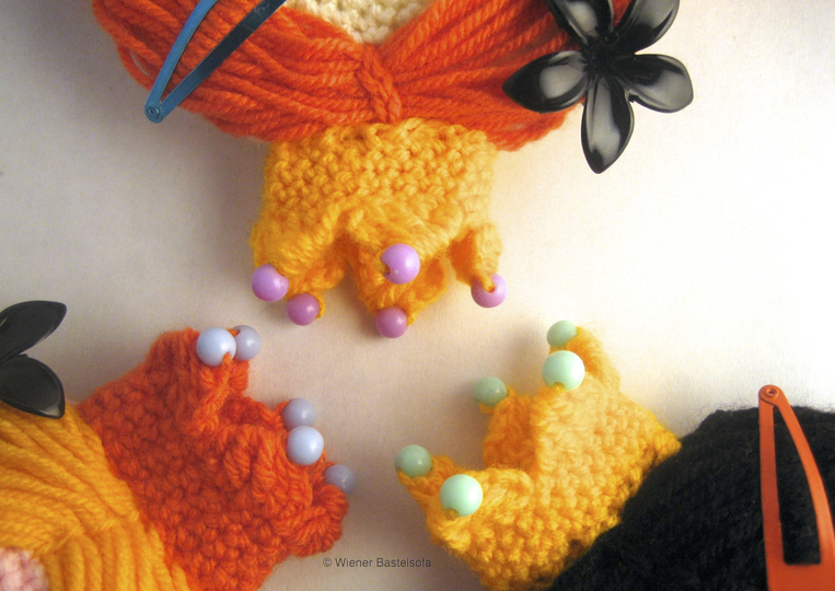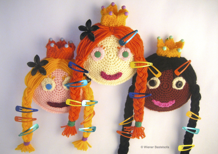 Sie hat einen Durchmesser von 13 cm und wird mit Resten von Schachenmayr Bravo (50 g/ 133 m) gehäkelt. Die Zopflänge kannst du nach deinen Wünschen variieren. Außer Wolle benötigst du noch 5 Perlen für die Krone, 2 Knöpfe oder Ziernieten für die Augen und etwas Füllwatte.