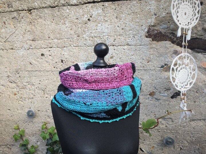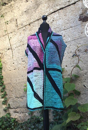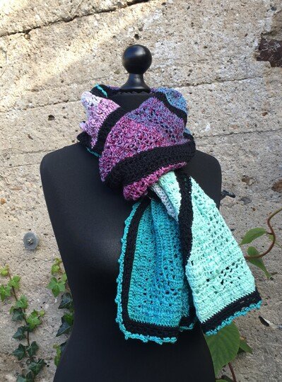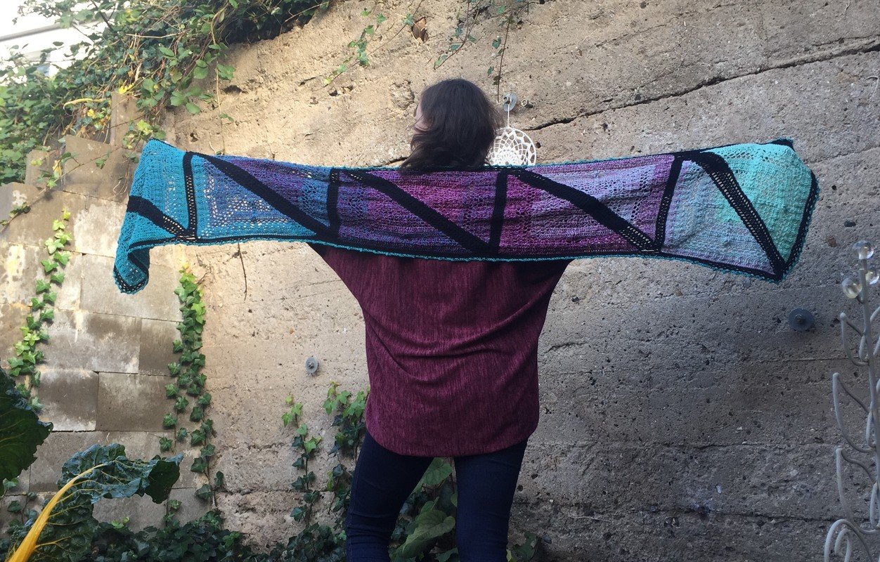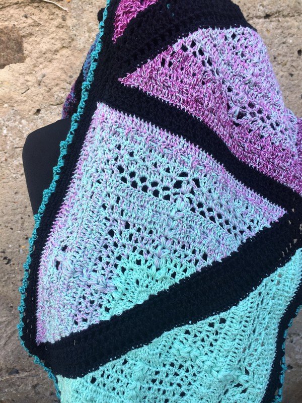 Aus dem Verlaufsgarn werden 10 Dreiecke mit einem romantischen Muster gehäkelt, nach dem gleichen Prinzip wie ein Dreieckstuch. Mit dem Kontrastgarn werden dann die Dreiecke zu Quadraten und die Quadrate schließlich zum Schal verbunden.