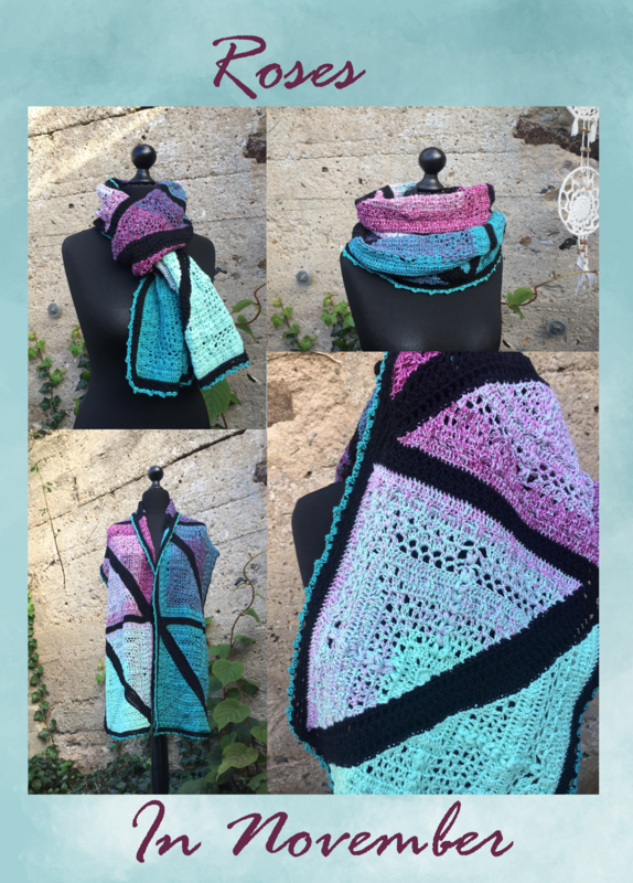 „Roses in November“ ist ein gehäkelter Schal mit einer Größe von circa. 200cm x 40cm.