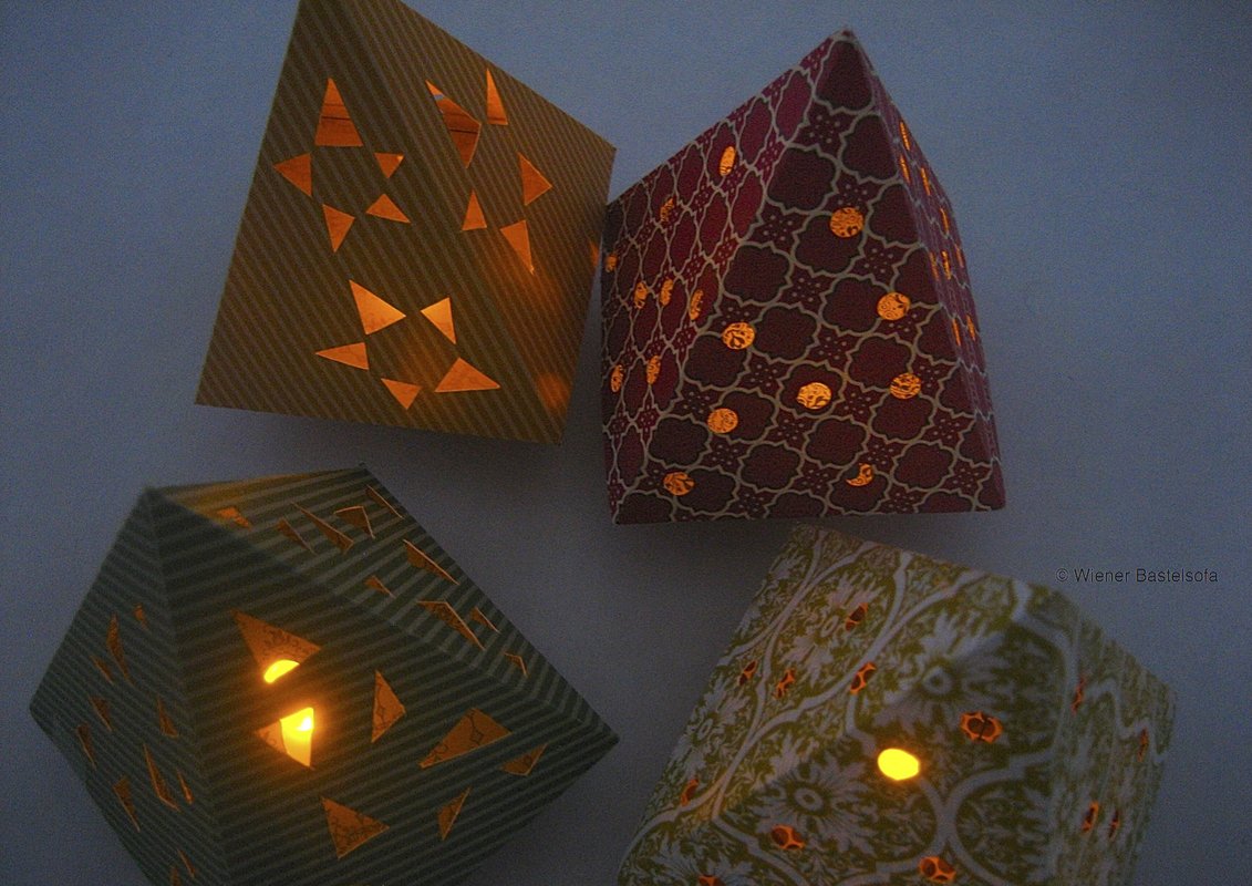 Du benötigst ein LED-Teelicht, Tonpapier oder Scrapbooking-Papier, einen Drucker, Schere, Kleber, Cutter und eventuell Motivstanzer oder eine Lochzange.