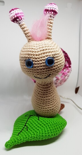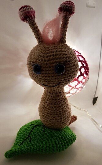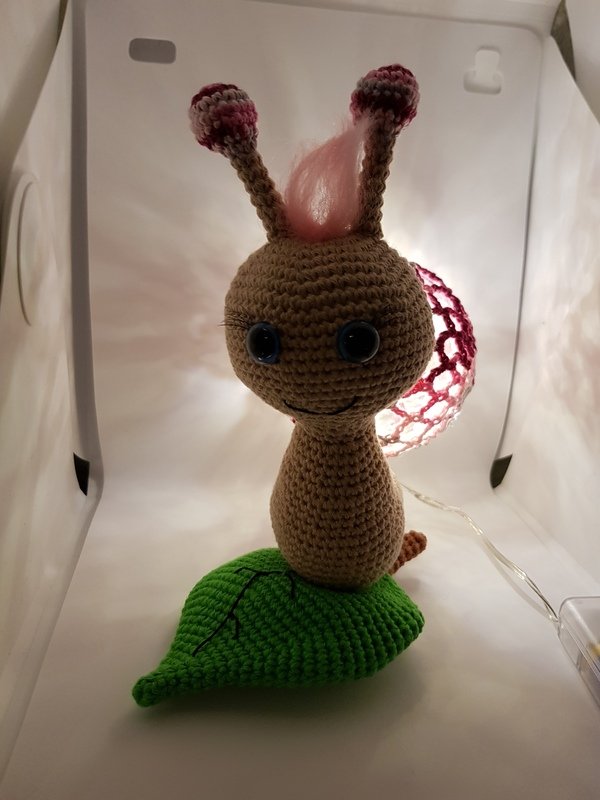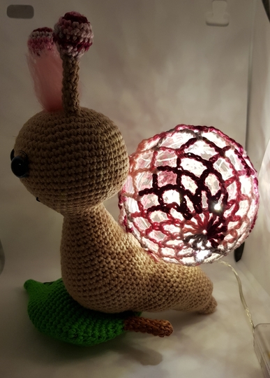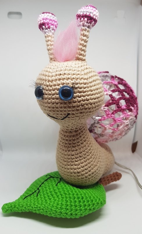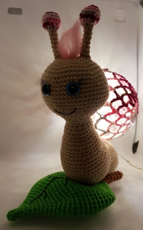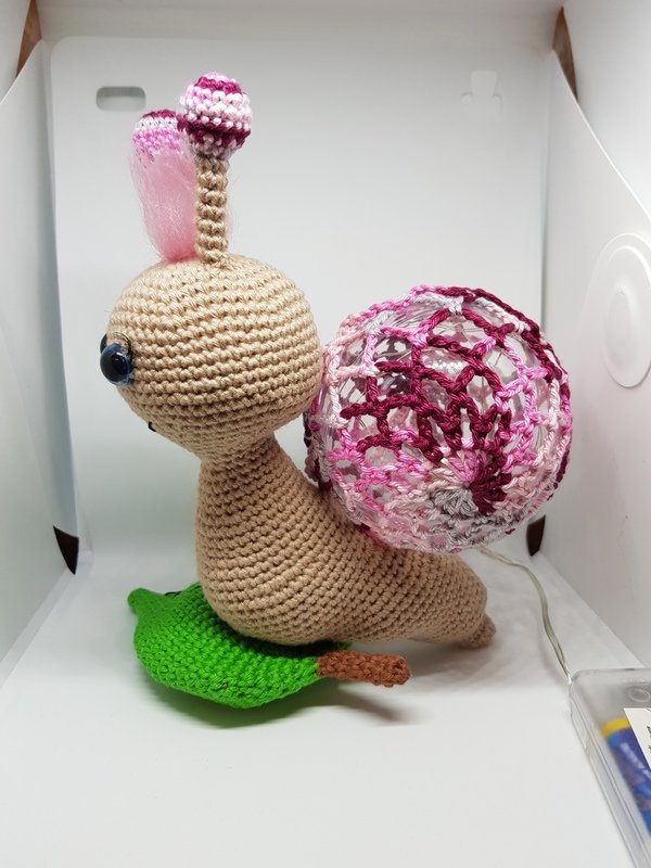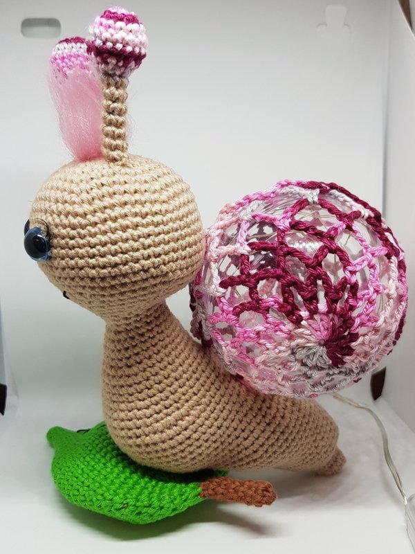 Hier bekommt ihr eine Anleitung für eine tolle Schnecken-Lampe, dienicht nur als Deko toll aussieht, sondern auch super als Nachtlicht dienen kann :) Du erhälst eine detaillierte Anleitung zu den einzelnen Teilen der Schnecke, sowie eine komplette Anleitung, zum umhäkeln einer Acrylkugel aus 2 Stücken (Variante 3). Die Anleitung beinhaltet viele Bilder. Weitere Varianten zum umhäkeln einer Acrylkugel, findet ihr in meinem Shop. \*\*Material\*\* Baumwolle in Beige (ca. 35g), Farbe eurer Wahl (ca. 15g), Grün (ca. 25g), etwas Braun etwas Filetgarn in Schwarz Eine teilbare Acrylkugel (Durchmesser 8cm) 1 Batteriebetriebene LED-Lichterkette Märchenwolle für die Haare (nicht zwingend notwendig) Häkelnadel 2,5mm Füllwatte Näh- oder Stopfnadel 1 Paar Sicherheitsaugen (meine waren 12mm) etwas Pappe künstliche Wimpern (kein muss) \*\*Kenntnisse\*\* fM = feste Masche MR = Magic Ring (Fadenring) LM = Luftmasche M = Masche WdLm = Wendeluftmasche KM = Kettmasche Stb = Stäbchen