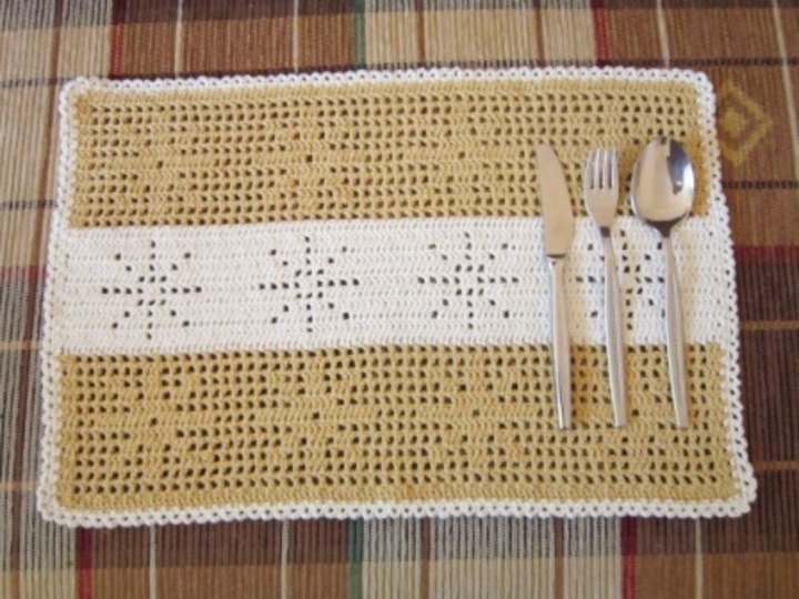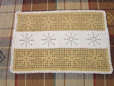 Bei mir ist das Platzdeckchen 42 cm x 29 cm. Ich habe es mit einer Häkelnadel 2,5 gearbeitet und ein Baumwollgarn LL 125m/50g verwendet. Wer fest häkelt, nimmt bitte eine Nadelstärke größer.