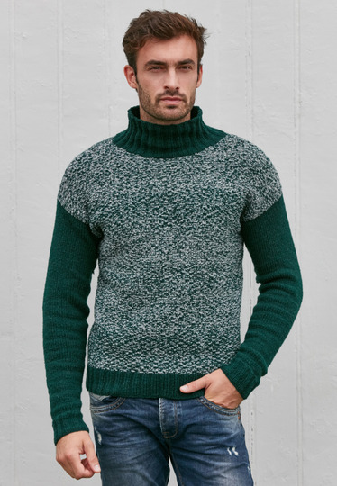 Lana Grossa "Cashmere 16 fine Degradé" (80% Schurwolle, 10% Kaschmir, 10% Polyamid, LL ca 320 m/50 g): ca 400 (450-500-550) g Schwarzgrün Fb 14 und 200 (250-300-350) g Hellgrau Fb 15; addi-Stricknd 3,5 und 4 mm; addi-Rundstricknd 3,5 mm, 40 cm lang.