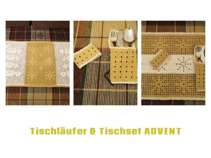 Die Anleitung für das Tischset Advent , bestehend aus Platzdeckchen, Serviettenring und Bestecktasche, umfasst 20 Seiten und ist reichlich bebildert. Für das Deckchen gibt es ein 1-seitiges Zählmuster. Die Filettechnik wird in Wort und Bild beschrieben.