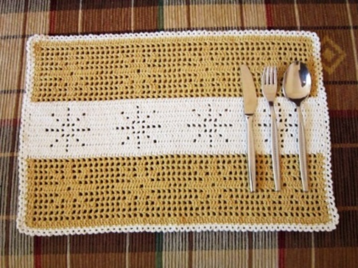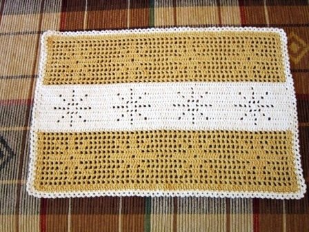 Bei mir ist der Tischläufer 86 cm x 42 cm und das Platzdeckchen 42 cm x 29 cm groß. Ich habe mit einer Häkelnadel 2,5 gearbeitet und ein Baumwollgarn LL 125m / 50g verwendet. Wer fest häkelt, nimmt bitte eine Nadelstärke größer.