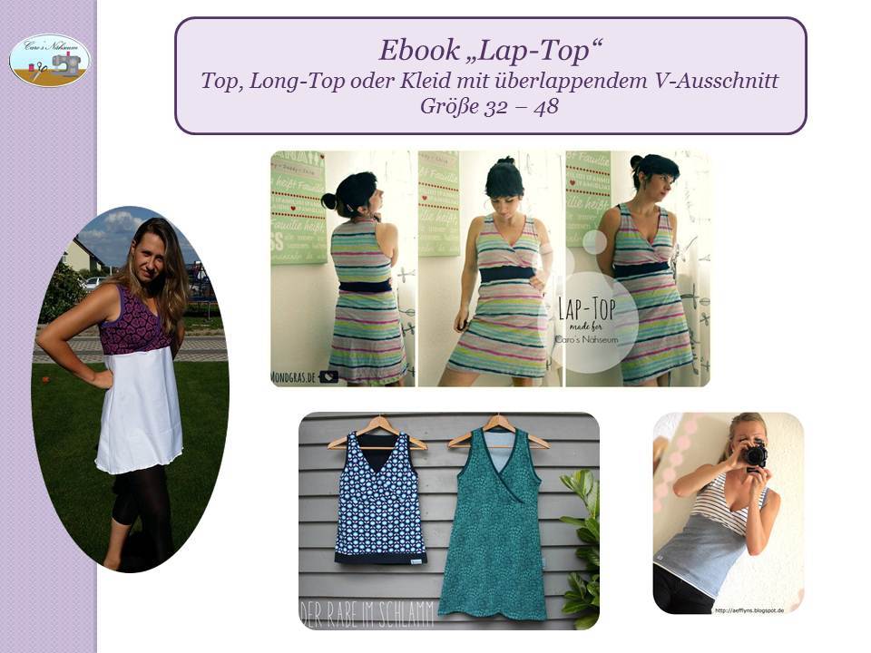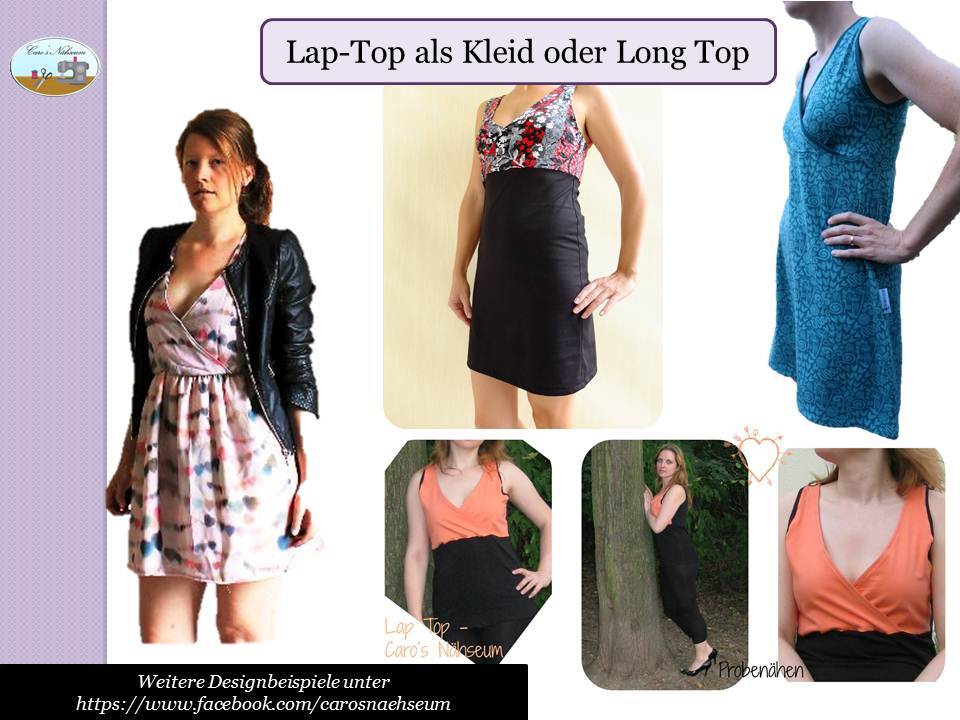 Es wird beschrieben wie du dir ein Lap-Top mit oder ohne Bündchen an Hals, Armen und Saum nähen kannst. Zudem hast du die Wahl zwischen einem kurzen, eher engeren und einem langen, eher weiteren Unterteil. Mit der langen Variante wird dein Lap-Top schnell und einfach zum Long Top oder Kleid.