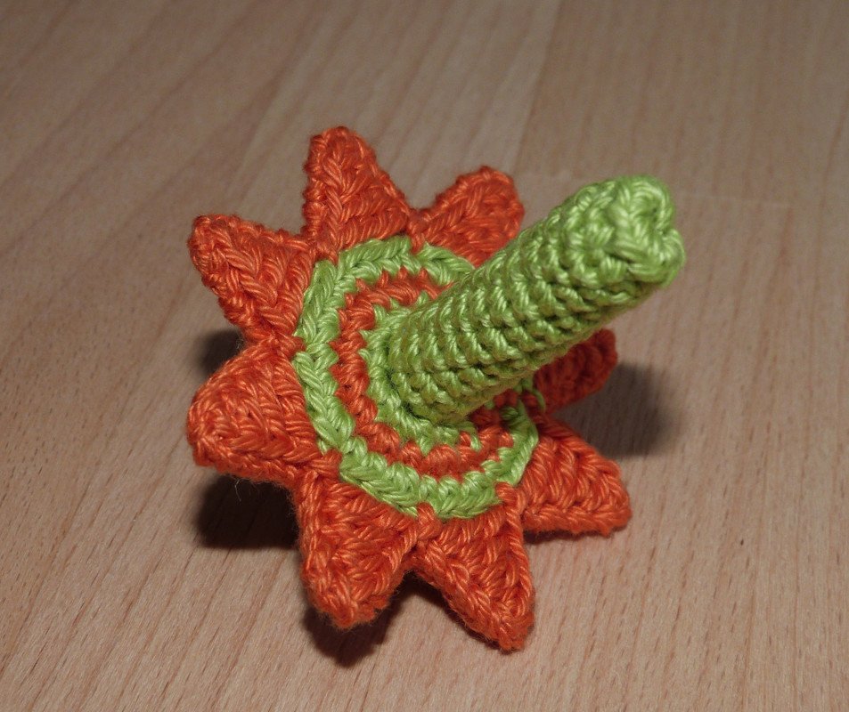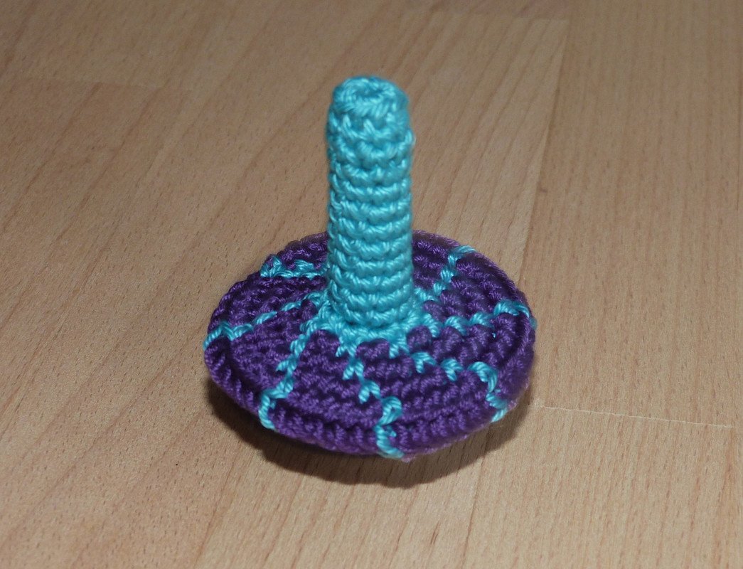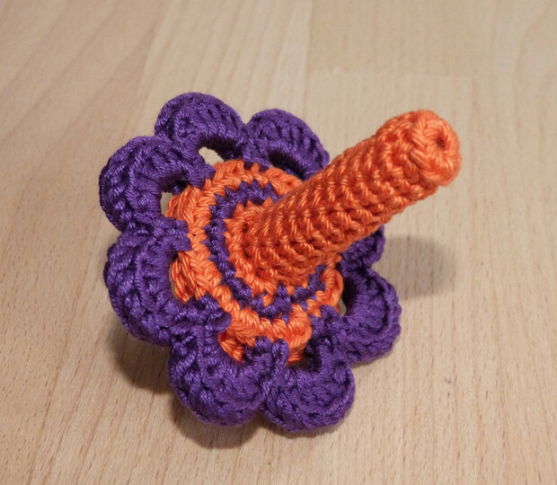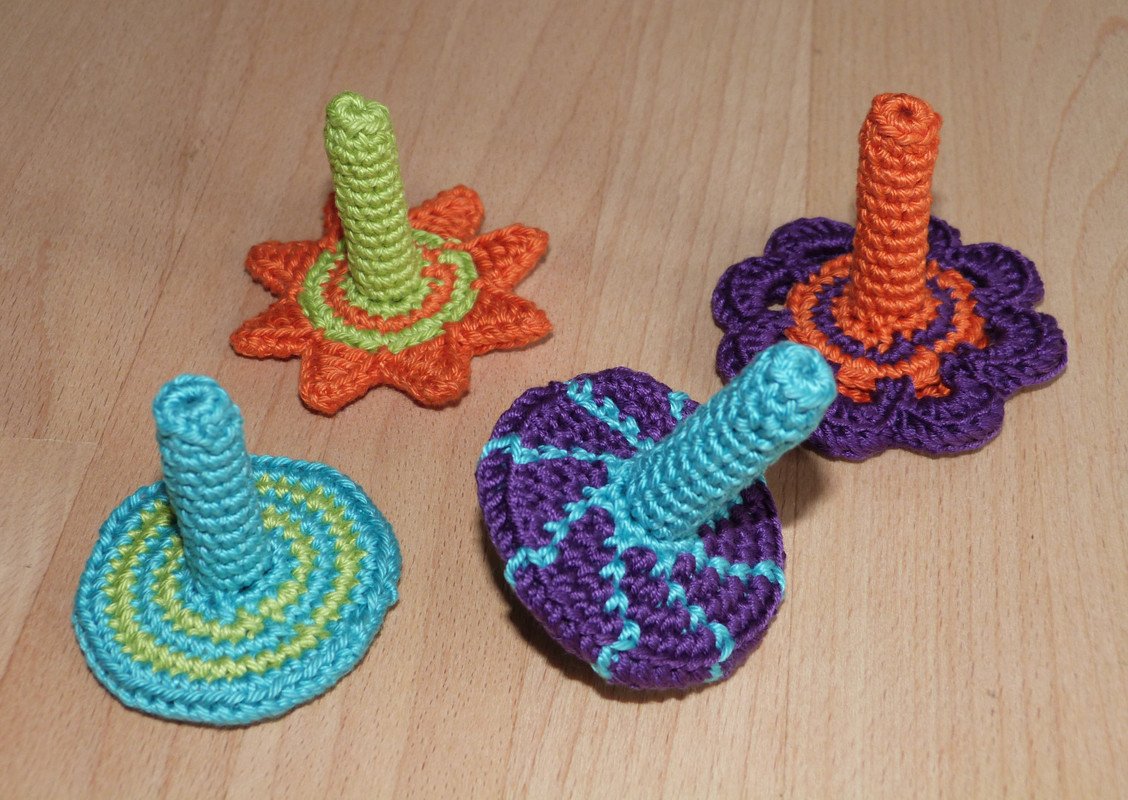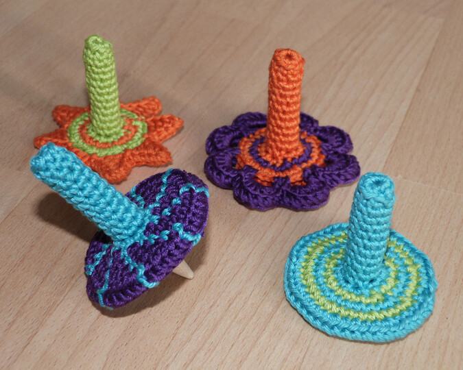 Häkelanleitung für Bleistift-Kreisel, 4 verschiedene Modelle: Streifen, Strahlen, Blume und Stern. Den fertig gehäkelten Kreisel einfach auf einen (nicht zu spitzen!) Bleistift-Rest stecken und kreiseln lassen..