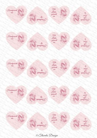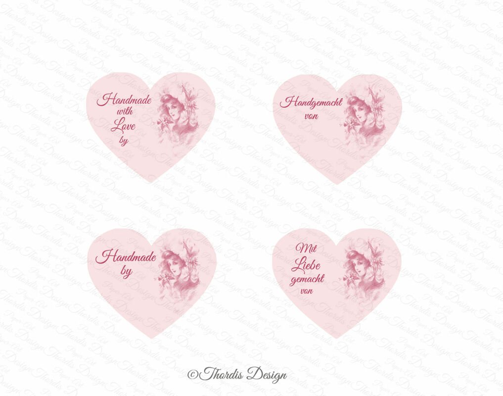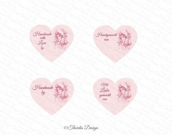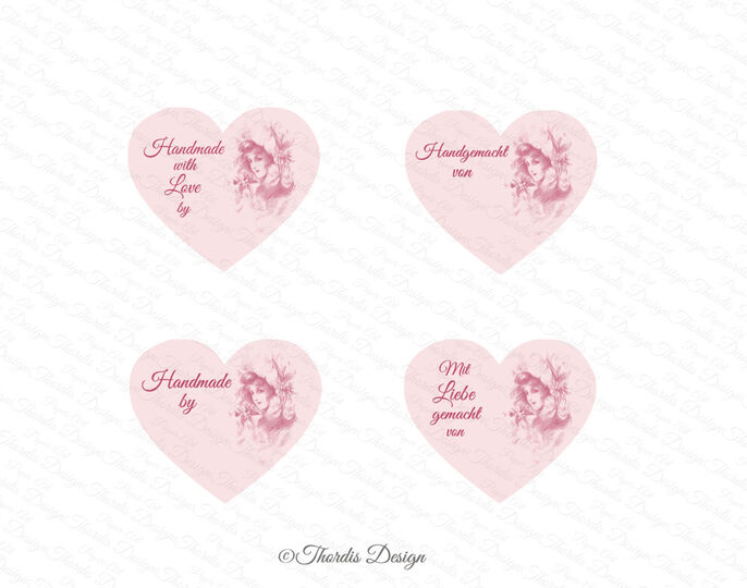 Auf dem "Bogen" sind je 5 Etiketten "Handgemacht von..." "Handmade by..." "Made with Love by...." und "Mit Liebe gemacht"