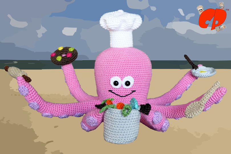 Kraki kocht. Mit seinen 7 Armen hat er alles im Griff. Nudelholz und Kochlöffel werden geschwungen und nebenbei auch noch Spiegeleier gebraten.