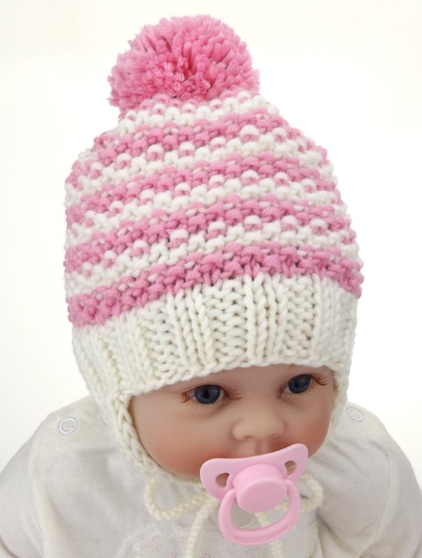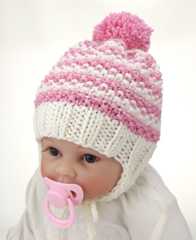 Die super süße Bommelmütze im Perlmuster mit Ohrenklappen hält die kleinsten Köpfchen warm! Sie ist in allen Farben süß und durch die Bändchen verutscht sie auch beim Liegen nicht! Ein tolles Geschenk für kleine Zuckerpuppen!