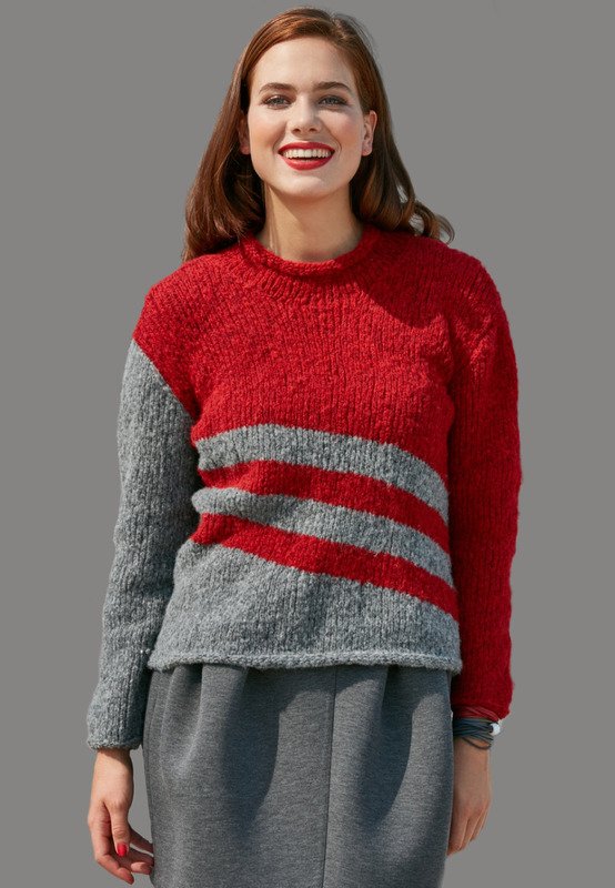Cooler Styling-Trick! Durch verkürzte, beziehungsweise verlängerte Reihen, entsteht bei diesem Flauschpullover das schräg verlaufende Streifendesign.