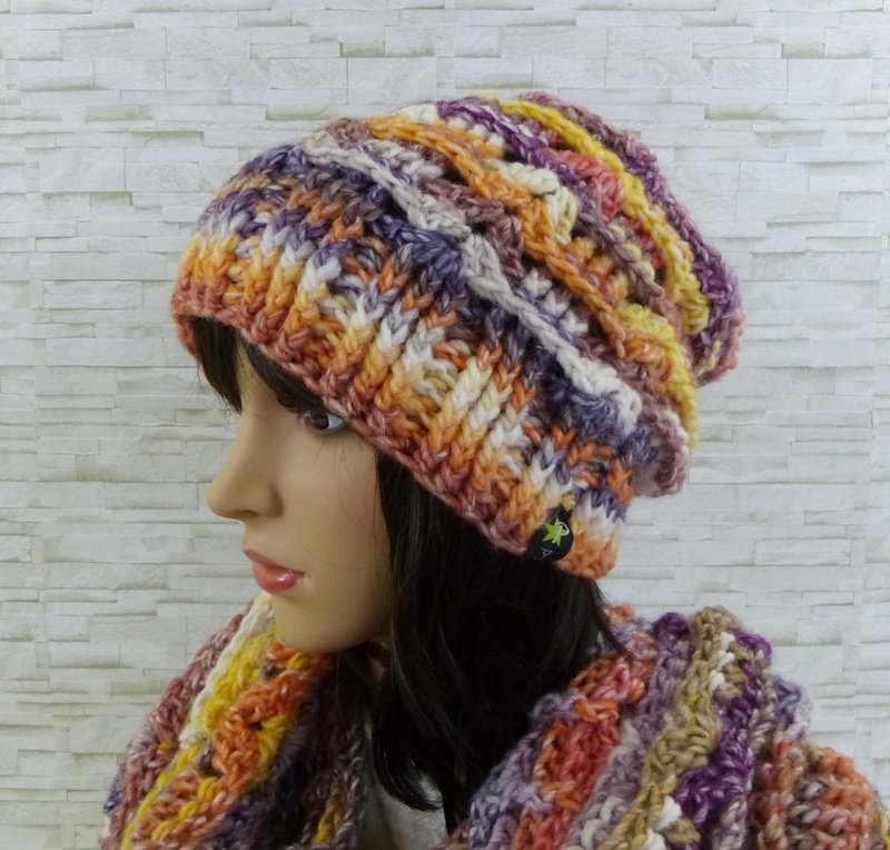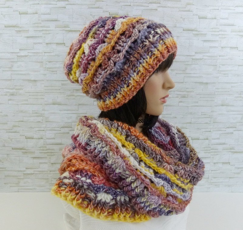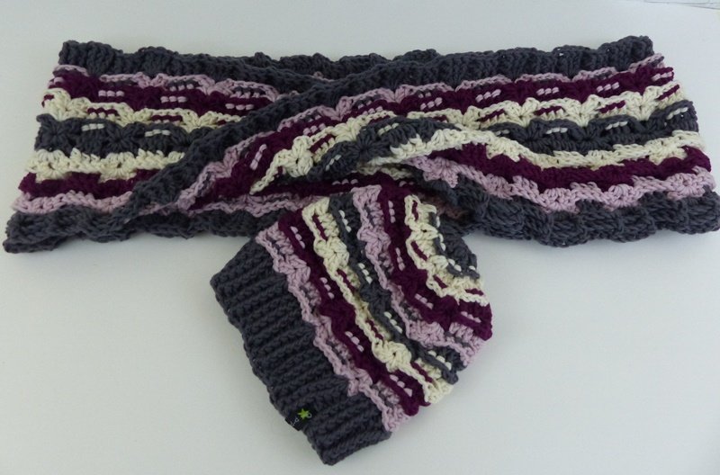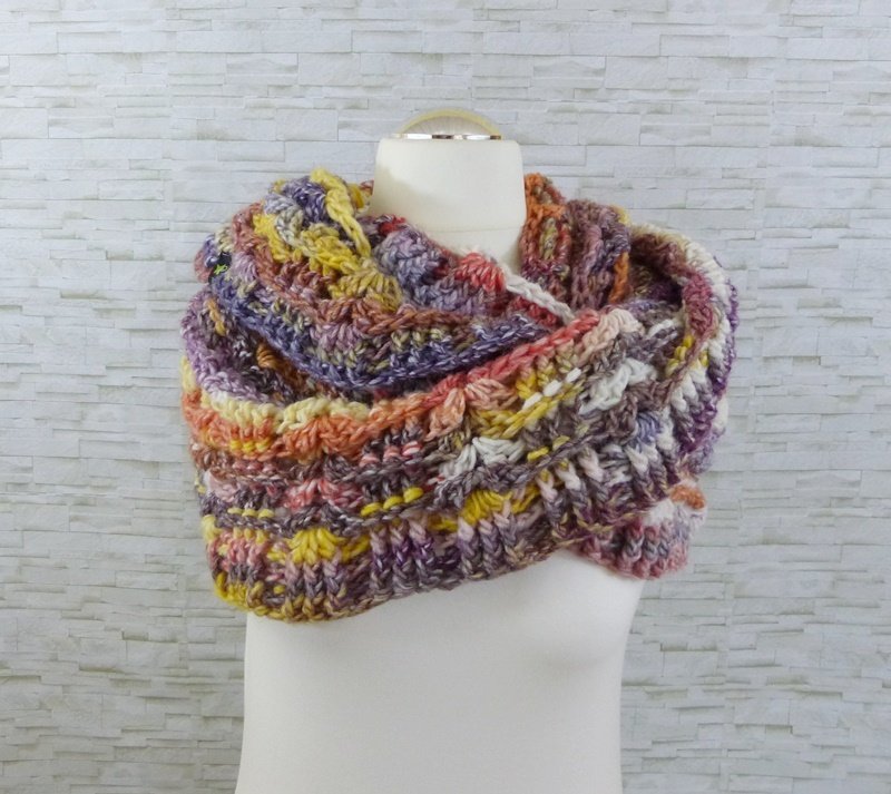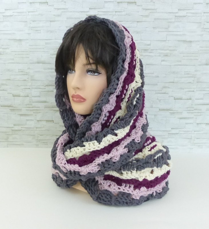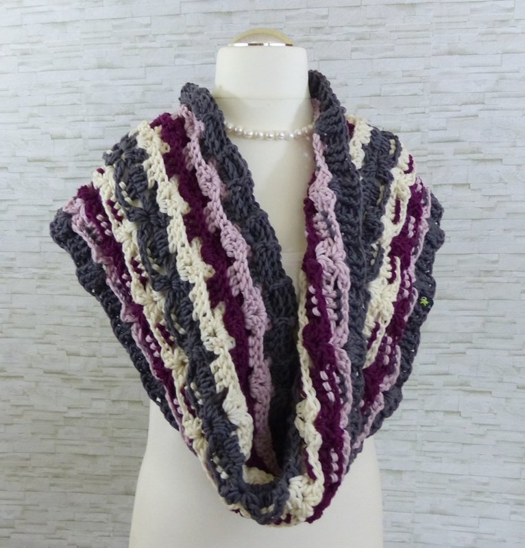 Dazu gibt es auch einen passenden Loop (Möbiusschal). Ein Möbiusschal ist in sich gedreht, daher erfolgt der Farbverlauf von der Mitte aus. Aufgrund der Drehung trägt sich der Loop sehr gut. Er kann aufgrund der Breite auch kurz als Kapuze über den Kopf gezogen werden.