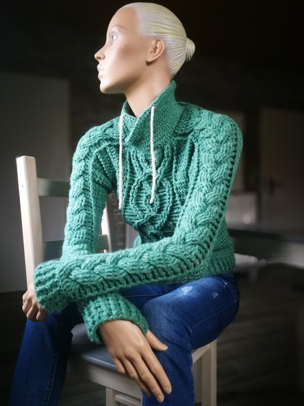 Häkelanleitung Zopfpullover Klarissa ist aus dickem Garn und daher perfekt für den Winter, aber auch für die Übergangszeit ist er ein zeitloser Pullover für jede Altersklasse den man immer tragen kann