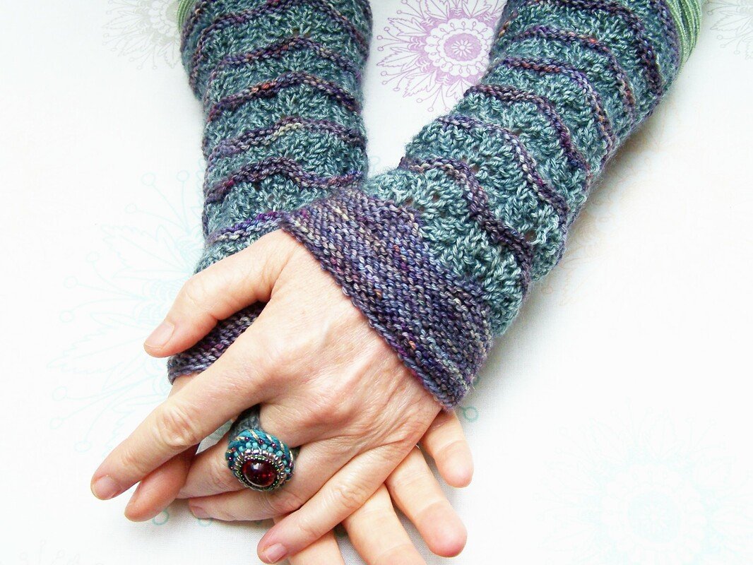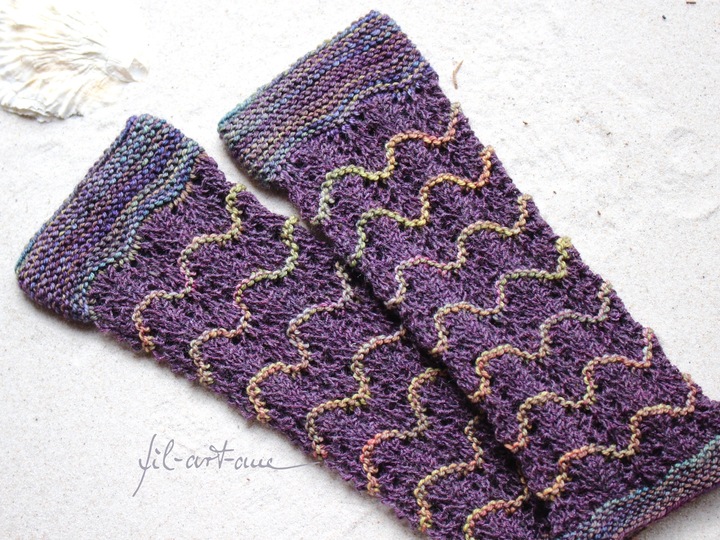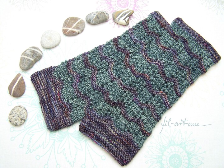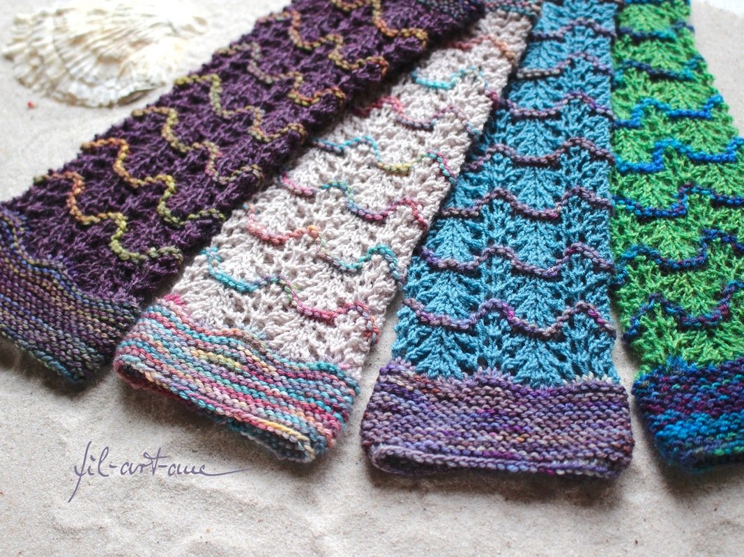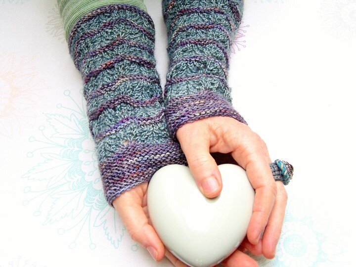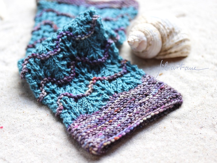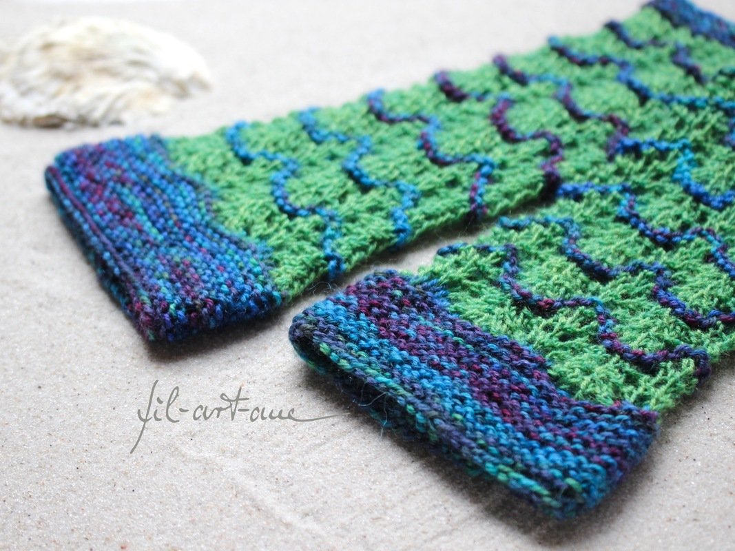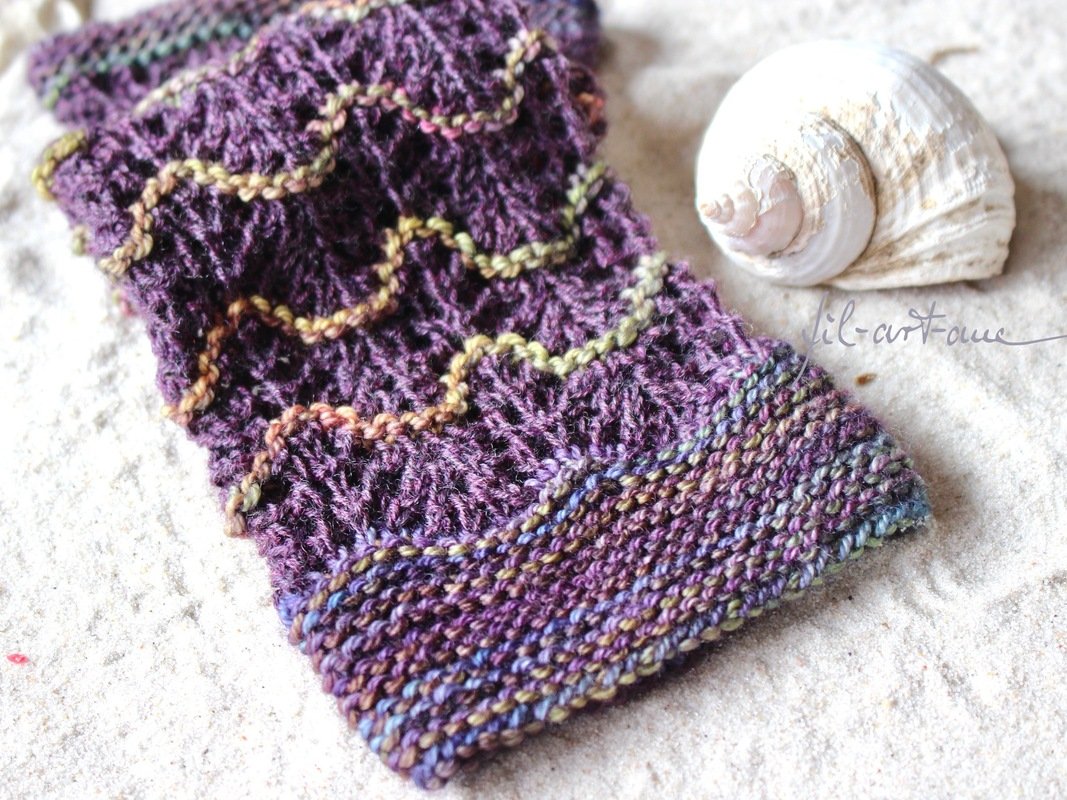 These cuffs are knitted in the round with 2 colours and a little lace pattern provides for gentle waves! They are knitted quickly, so if you’re looking for a smart, little project or for a small present to give away, this is a good choice! The pattern includes both, written instructions and charts as well as a description for 2 sizes. You can knit with (light-) fingering-weight yarns as well as a lace-weight version! The instructions are easy to follow, making these lovely cuffs a good project for lace beginners!