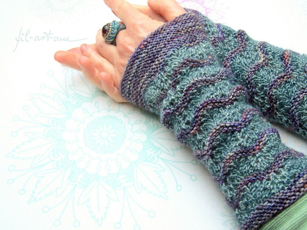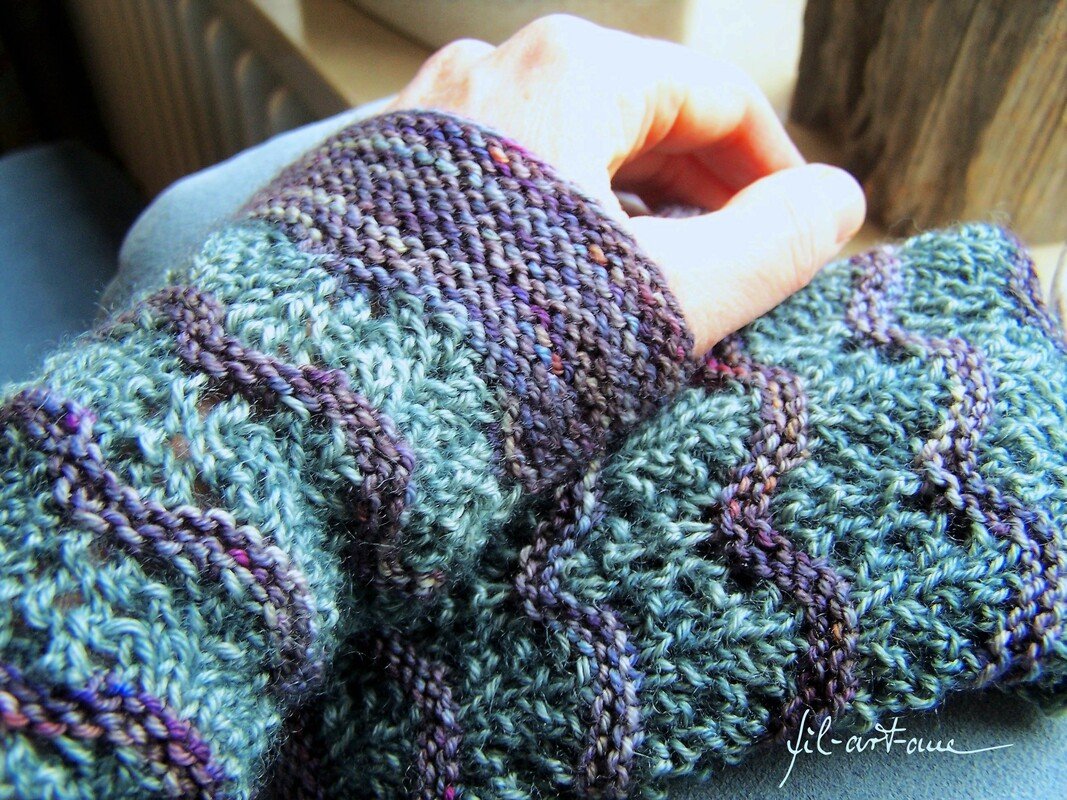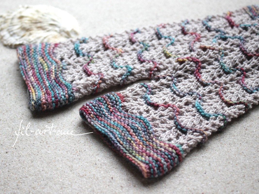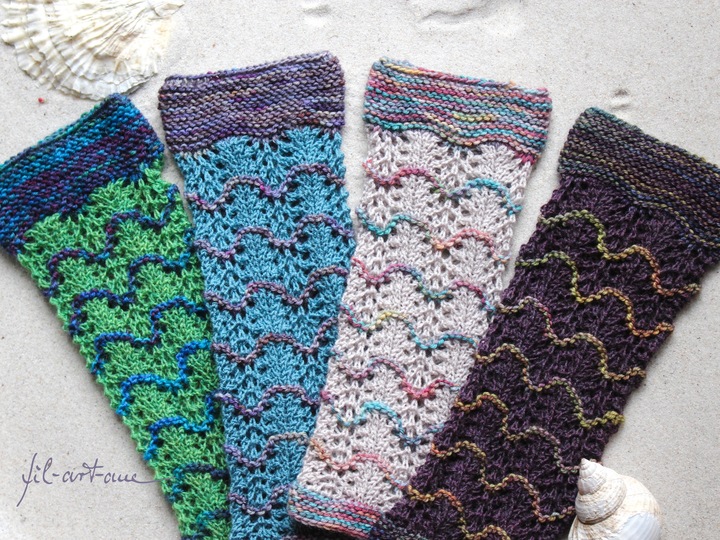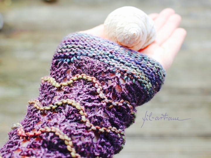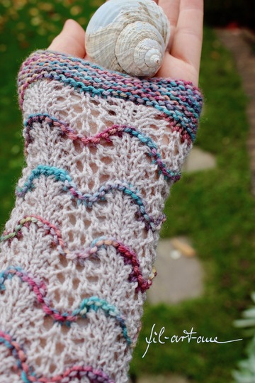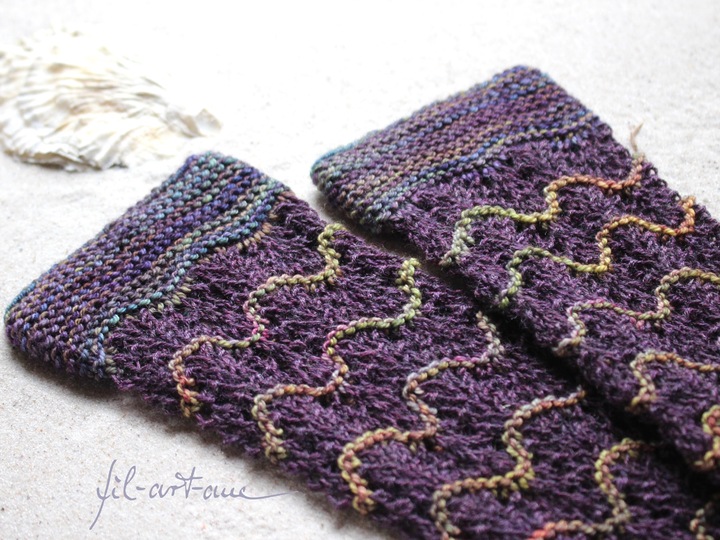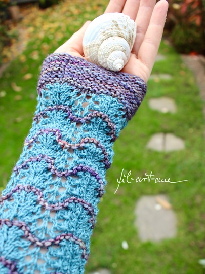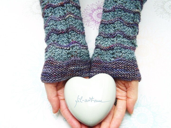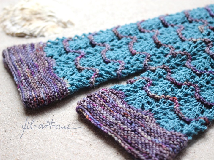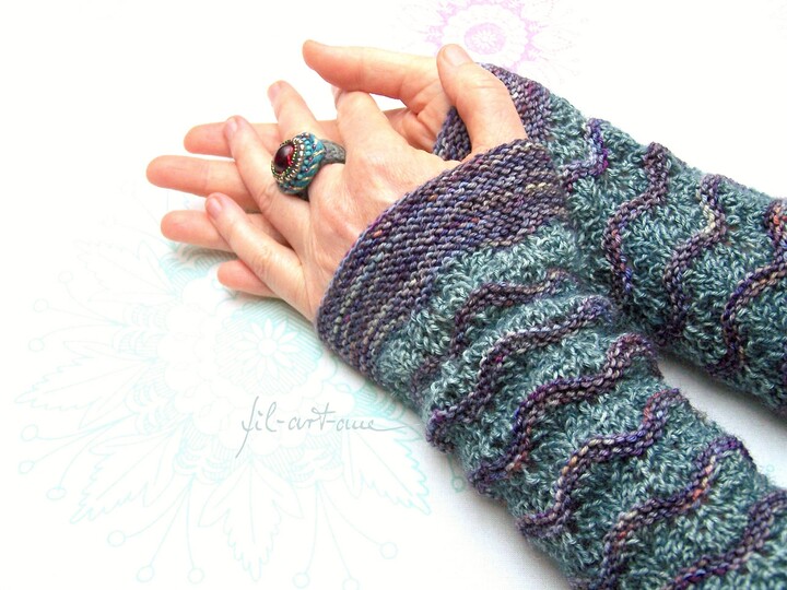 These cuffs are knitted in the round with 2 colours and a little lace pattern provides for gentle waves! They are knitted quickly, so if you’re looking for a smart, little project or for a small present to give away, this is a good choice! The pattern includes both, written instructions and charts as well as a description for 2 sizes. You can knit with (light-) fingering-weight yarns as well as a lace-weight version! The instructions are easy to follow, making these lovely cuffs a good project for lace beginners!