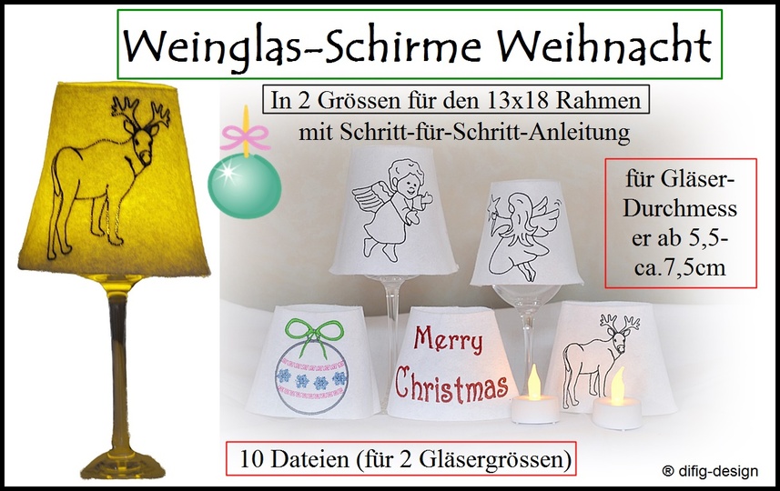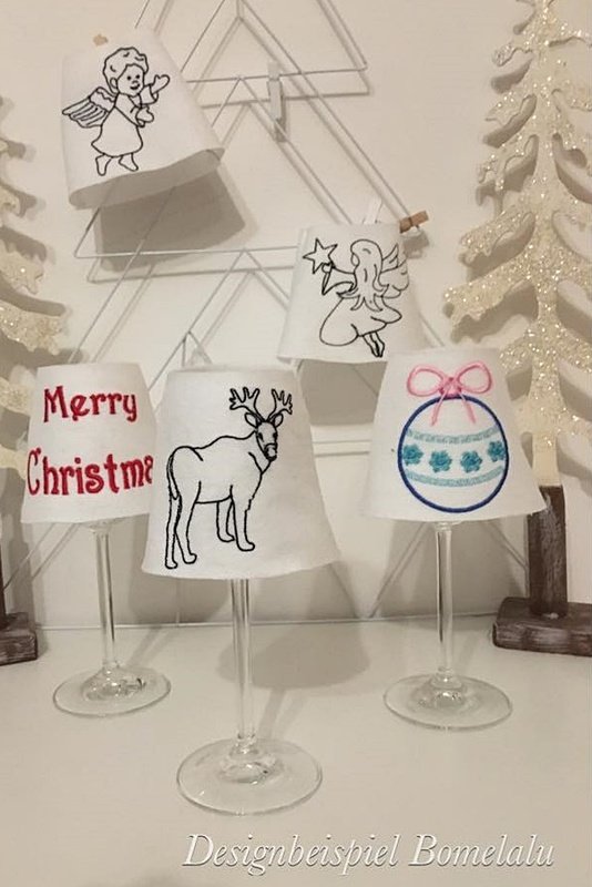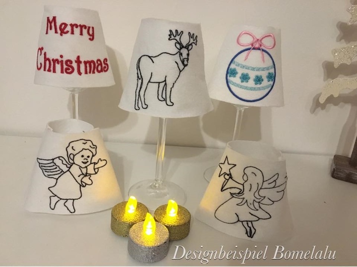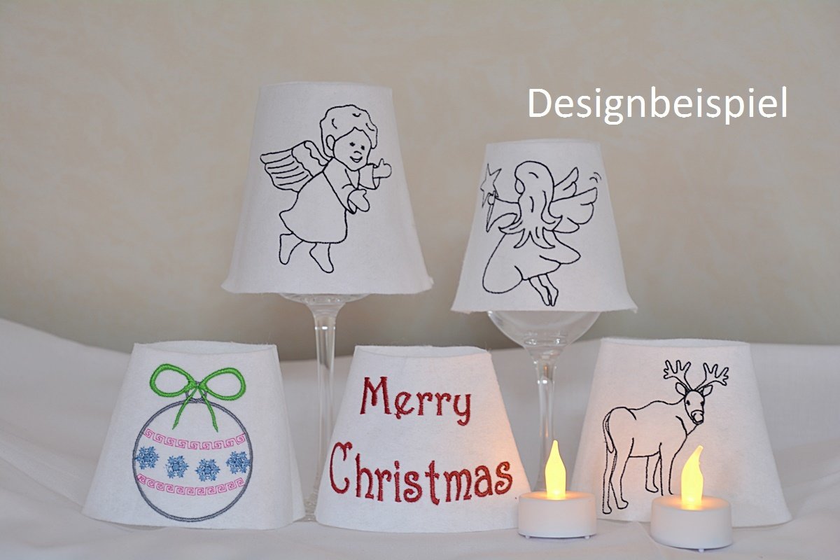 Haben Sie Weingläser die fast das ganze Jahr im Schrank stehen? Jetzt gibt es einen Grund sie hervor zu holen und sie zu schmücken. Sticken Sie sich stilvolle Schirmchen zum Thema Weihnacht, stülpen Sie diese über Weingläser und legen Sie ein Led-Teelicht in das Glas.