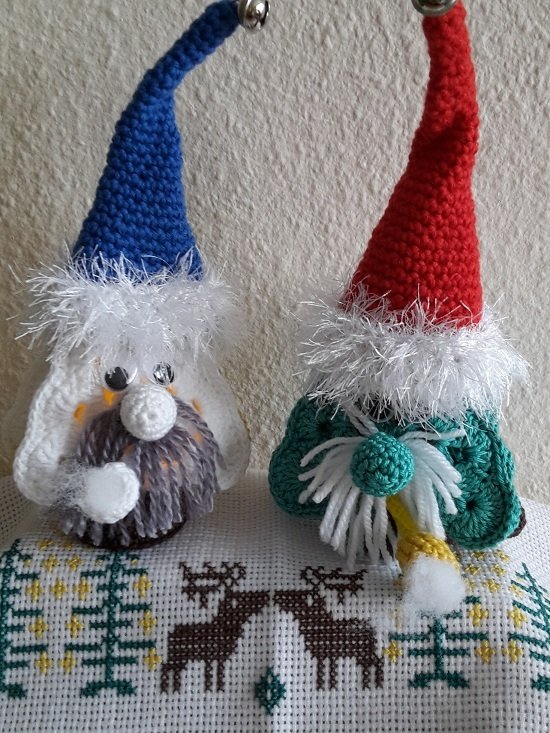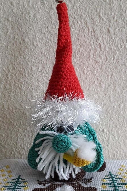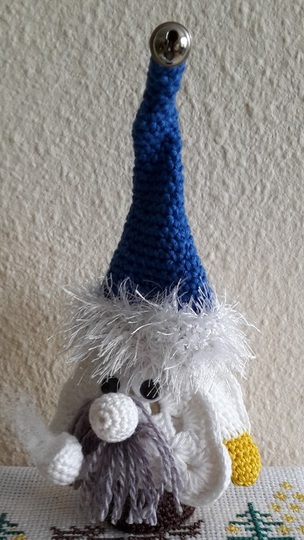 Ich wurde im Granny-Style gehäkelt und bin mit Mütze ca. 24 cm groß. Da mein Stamm hohl ist, kann man dort sehr gut ein LED-Teelicht verstecken. Wenn ich dann im Dunkeln leuchte und dazu noch mein Pfeifchen schmauche, wird mir gemütlich warm.
