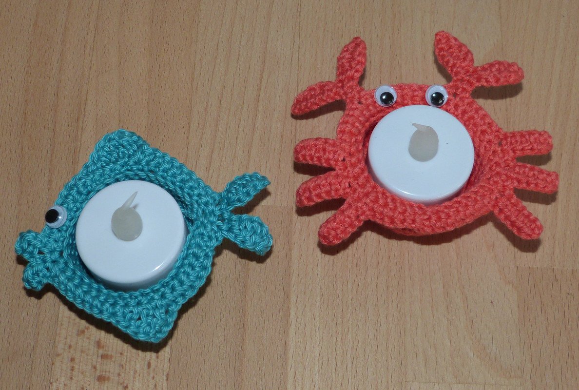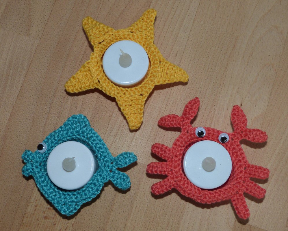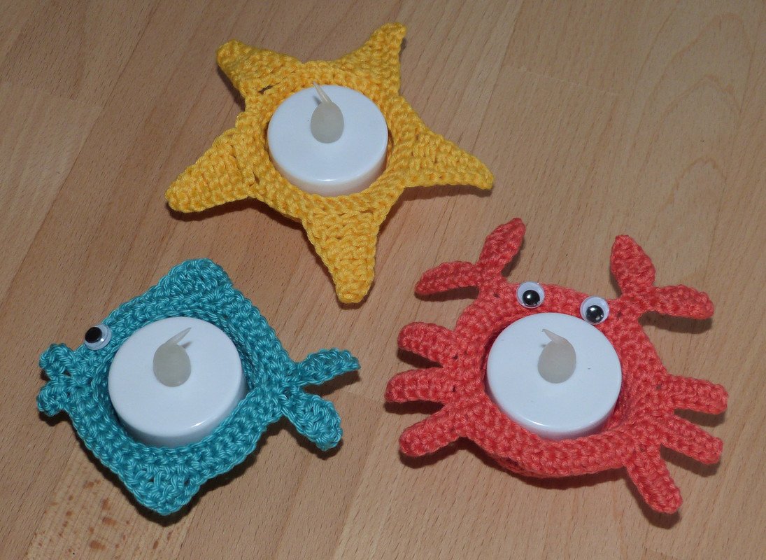 Häkelanleitung für 3 maritime Teelichthalter: Fisch, Krabbe und Seestern.