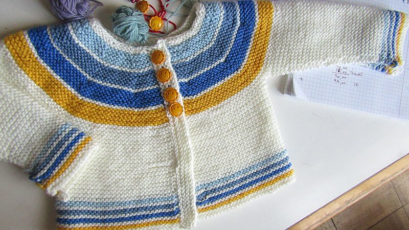 Dieses Kinderjäckchen wird in einem Stück in Hin- und Rückreihen und nur mit rechten Maschen gestrickt und hat nur 2 Nähte - perfekt für Anfänger!