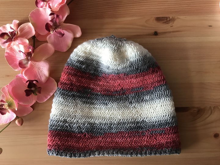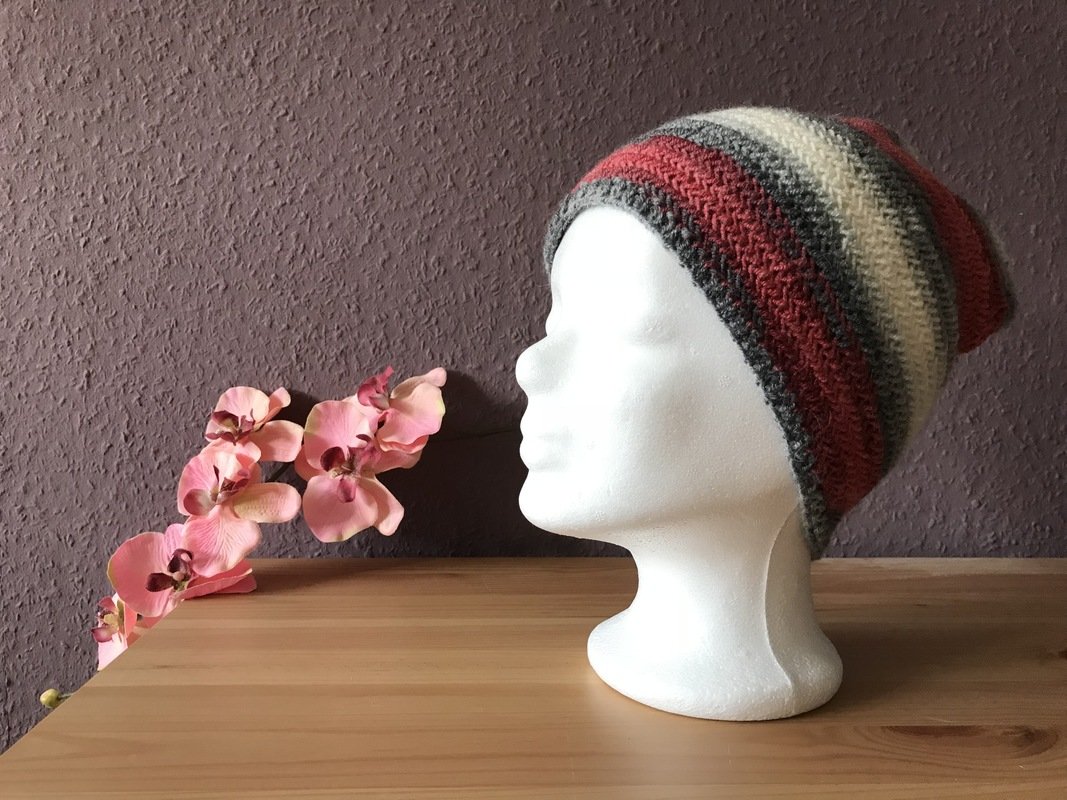 Diese Mütze wird im Fischgrätmuster gestrickt. Sie erhält dadurch eine feste Struktur und hält schön warm. Mit der passenden Farbwahl kann sie sowohl von Damen als auch von Herren getragen werden.