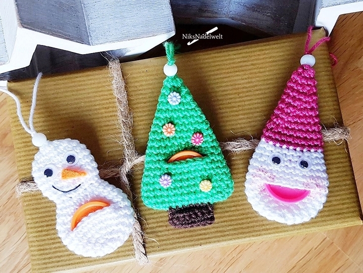 Mit diesem tollen Sparset, Schneemann, Tannenbaum und Nikolaus, kannst du dir diese süßen Anhänger häkeln. Sie sind total vielseitig - als hübscher Geschenkeanhänger, dekorativer Baumschmuck oder cooles Einkaufschipversteck. Alternativ zum Chip kannst du auch einen Geld- oder Gutschein falten und in den Schlitz stecken. Die Drei sind sehr schnell gehäkelt, es wird wenig Wolle benötigt, so dass prima Wollreste verarbeitet werden können.