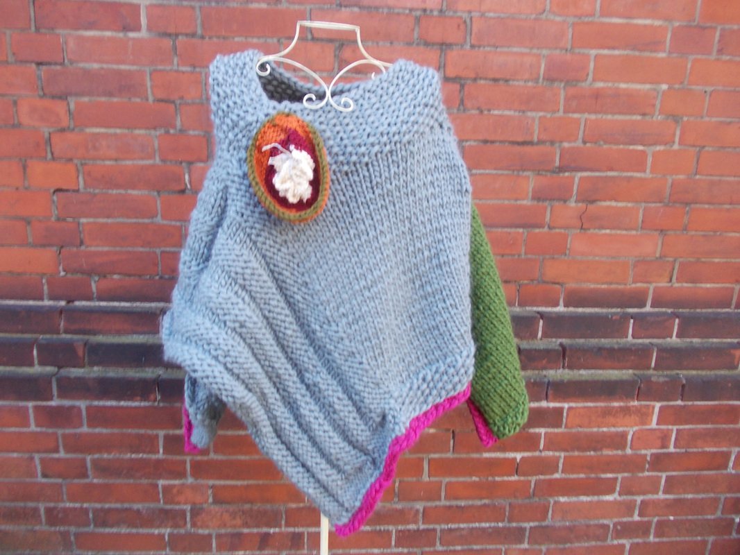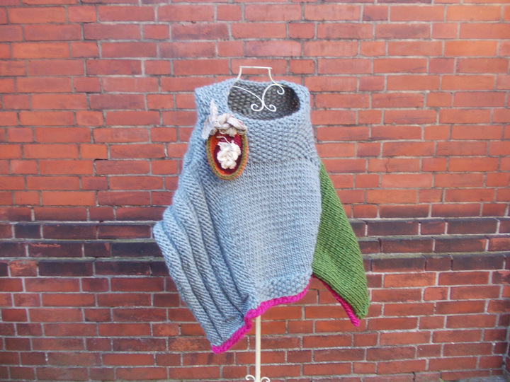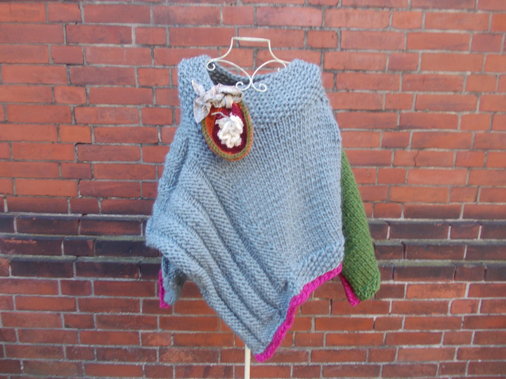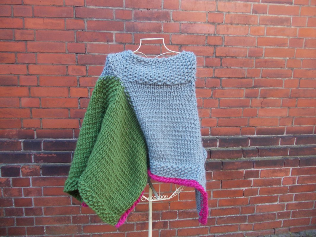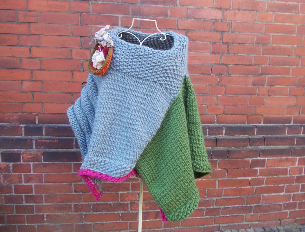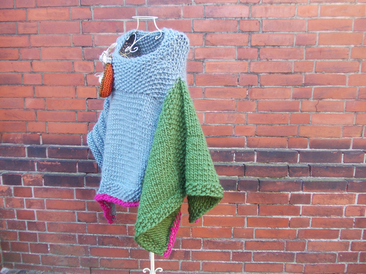 Der Poncho kann einfarbig oder bunt gestrickt werden; für meinen Poncho habe ich grau, (Jäger) - grün und pink verwendet.