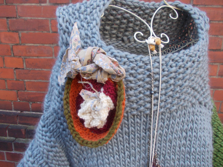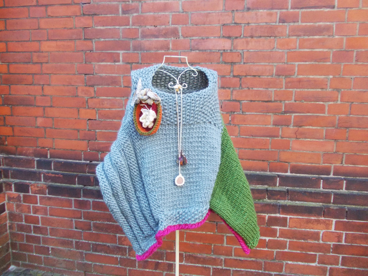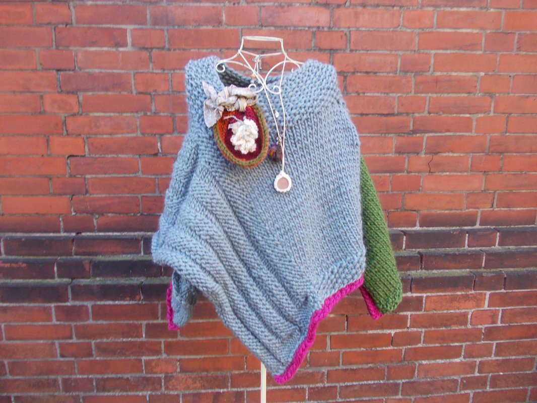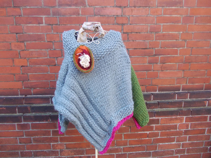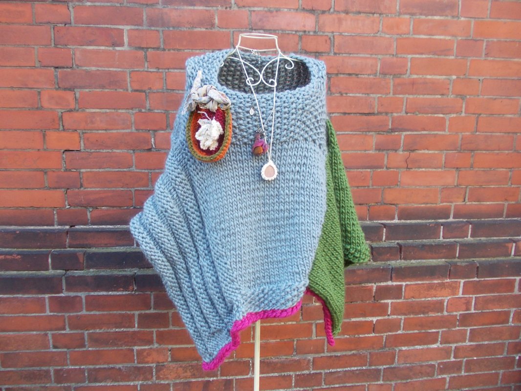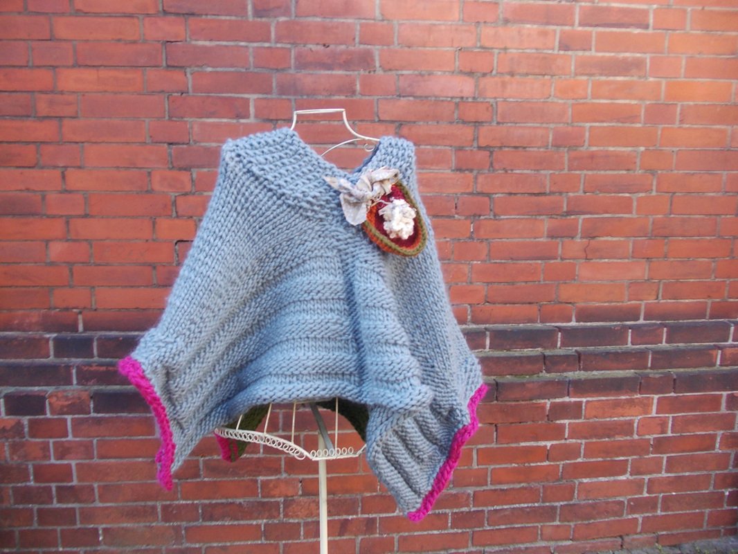 Der Poncho kann einfarbig oder bunt gestrickt werden; für meinen Poncho habe ich grau, (Jäger) - grün und pink verwendet.