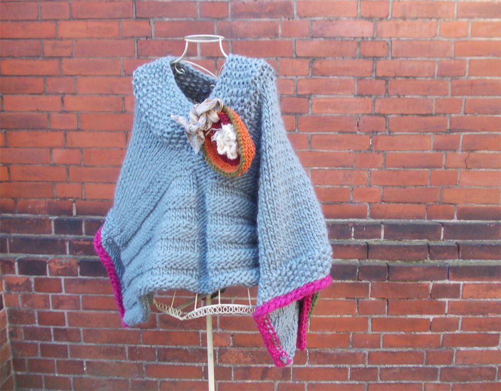 Poncho "Ein Haus von Romantik", mit Strickblume/Stoffschleife (auch für Herren geeignet)